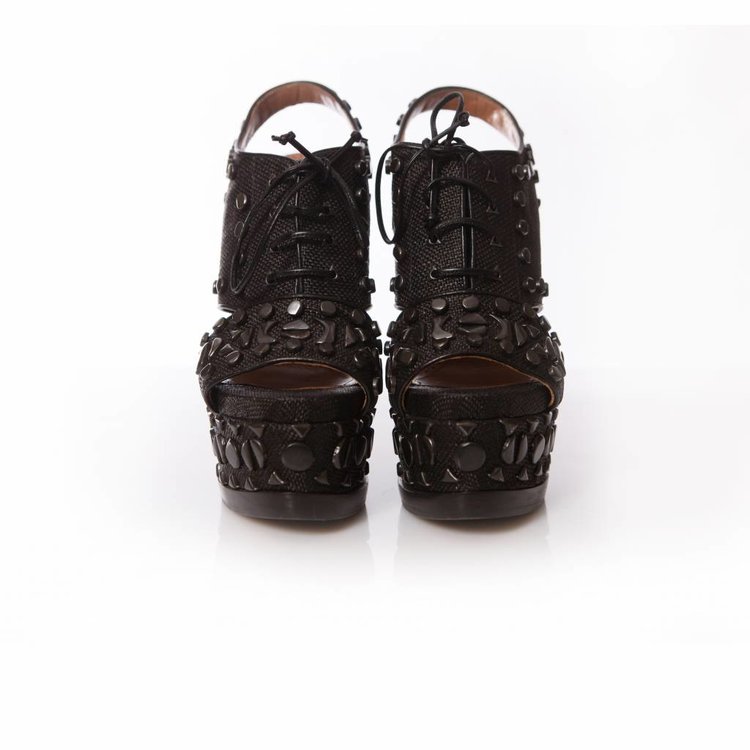 • Alaia, black woven laced up platform sandals with studs in size 37. This products is brand new and comes with the original box and dustbag.
