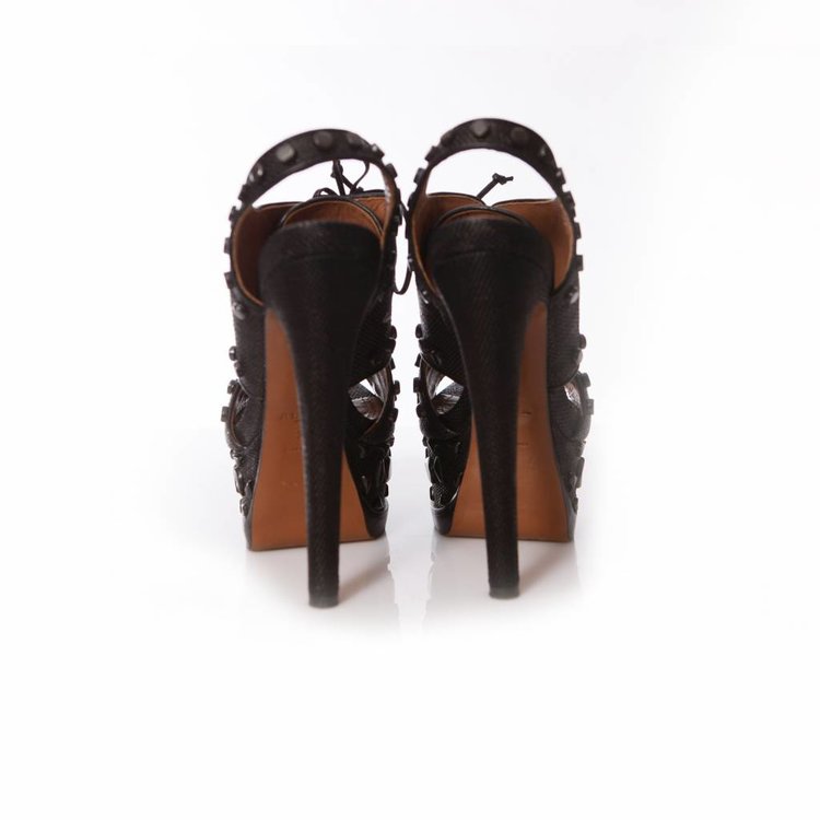 Alaia, black woven laced up platform sandals with studs in size 37.