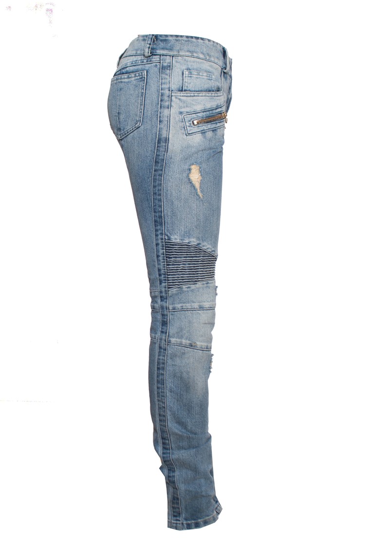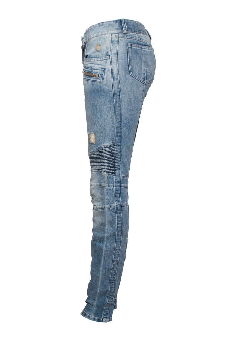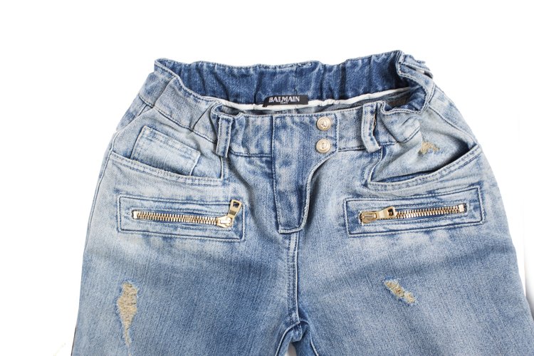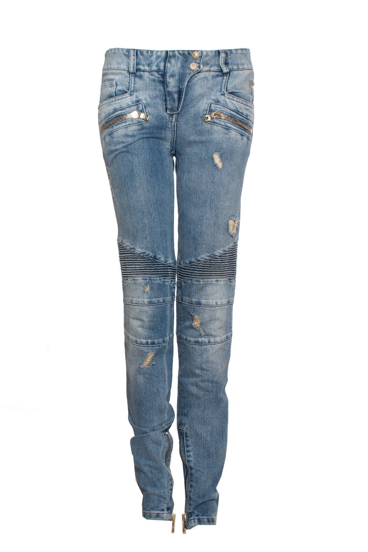 Balmain, Light blue jeans with lurex and gold zippers. The item is slightly adjusted with an elastic waistband so that the pants fit on the back. The item is in good condition.
