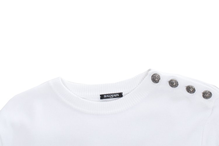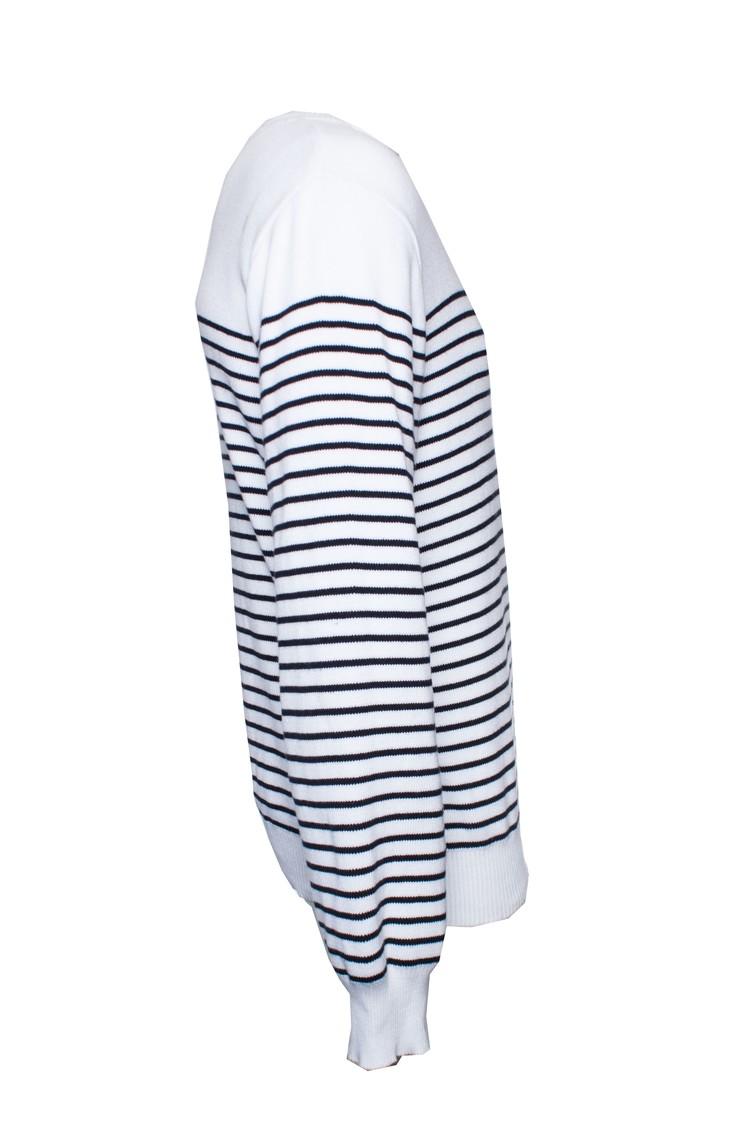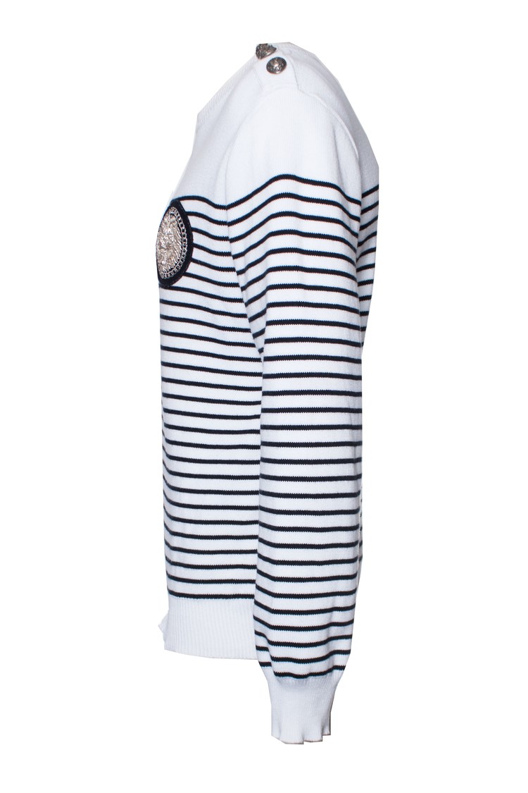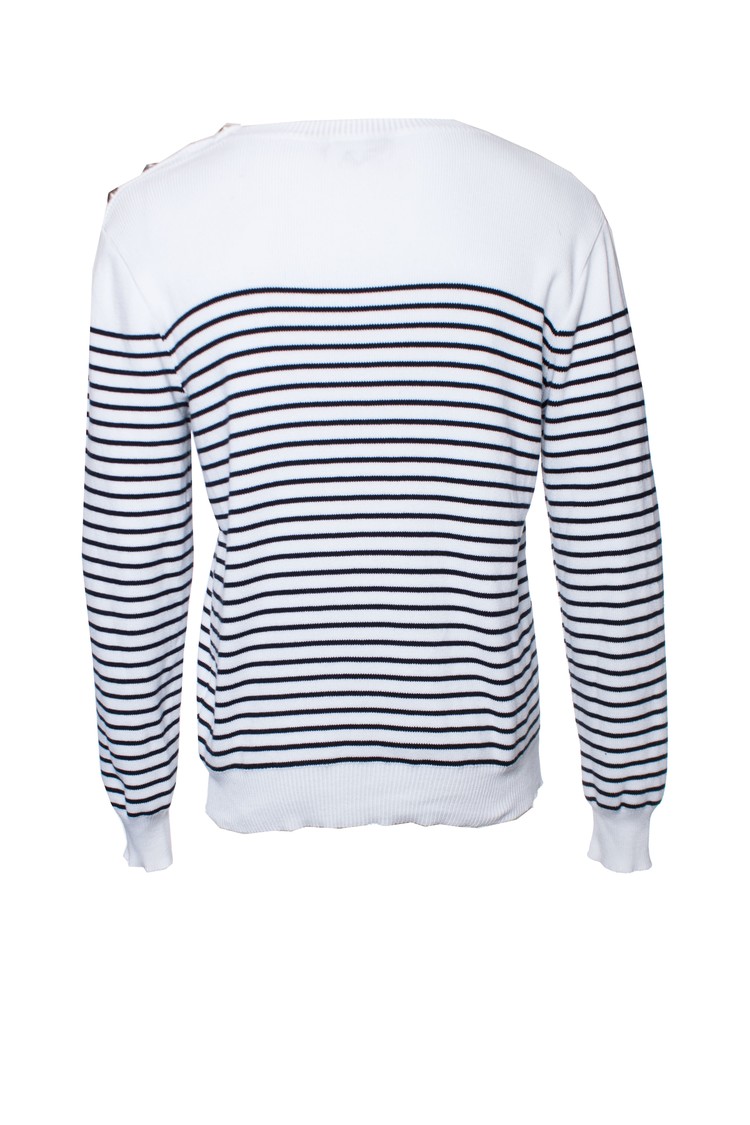 Balmain, White sweater with black stripes in size XL. The sweater has buttons on the left shoulder and a lion patch on the chest. The item has light signs of wear on the top of the back, further in good condition.
