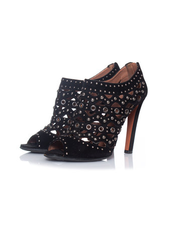 Alaia, Black leather lasercut peep-toe lace-up sandals. This item has two scuffs on the left heel and one damage on the right outer heel, further in good condition.