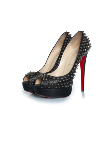 Christian Louboutin, Velvet Fifi spikes 100 pumps in black. Studs are damaged on tops. Some bald spots on the fabric, especially on the noses. Light damage on the heels.