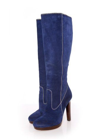 Dsquared2, Blue suede boot with wood lacquered platform in size 39. The item is in very good condition. The boot has two small dents on the right heel, and a small scratch on the left heel.