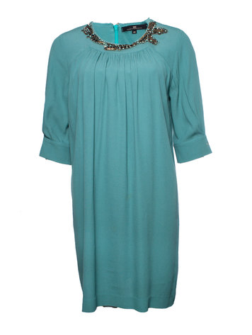 Elisabetta Franchi, turquoise tunic dress with stones around the collar. The item is missing a number of stones, otherwise in good condition.