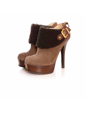 Fendi, Brown suede ankle shoots with shearling wool in size 36. The shoes have been worn only a few times and have some minimal scratches on the heels but are in good condition. Details/Hardware are in gold.
