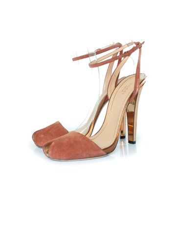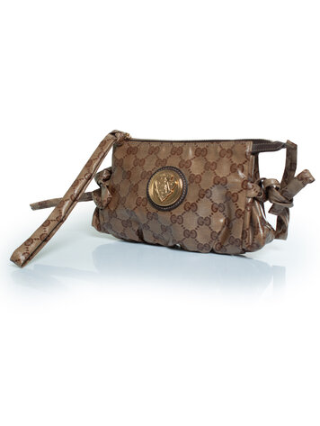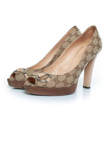 Gucci, GG canvas horse bit peep-toe pumps in brown and beige. Light signs of wear on the heels further in good condition. Comes with box, dustbags and cards