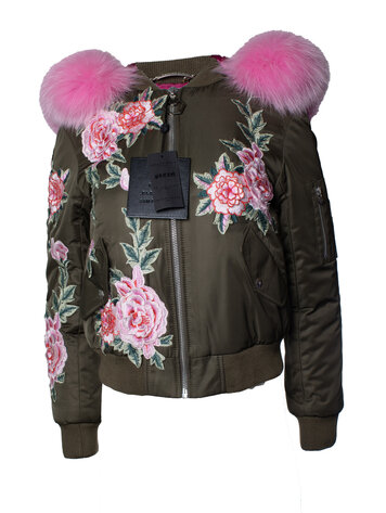 Philipp Plein, hooded bomber with floral embroidery and fox fur. The item is new with tag.