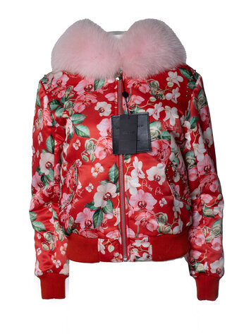 Philipp Plein, red orchid printed bomber with fur. The item is new with tag.