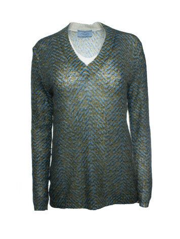 Prada, blue and green printed v neck sweater. The item is in good condition.