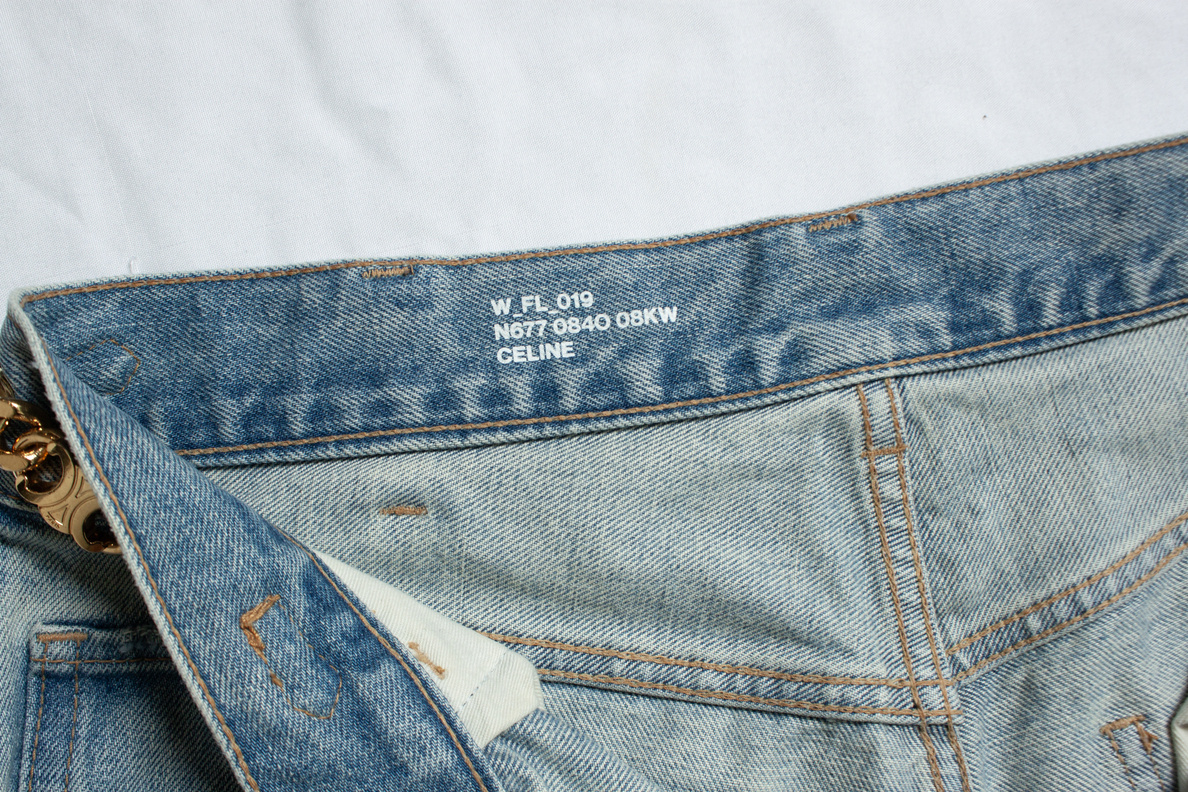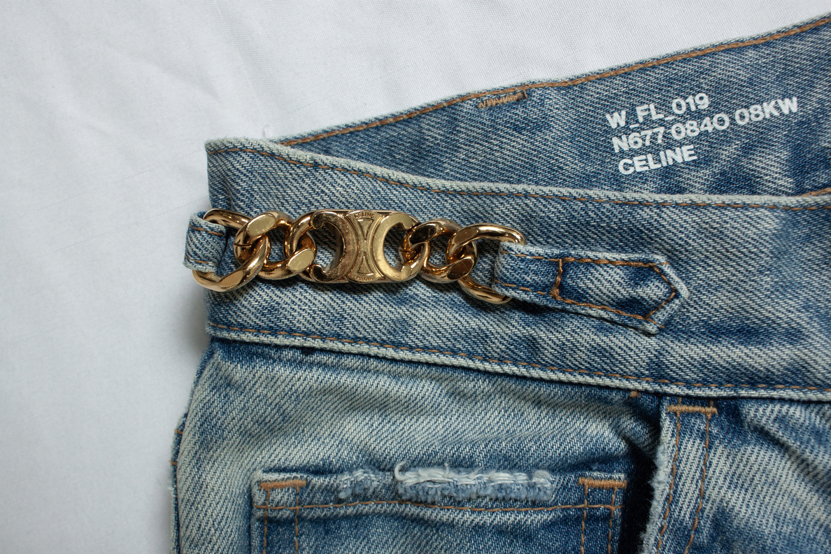 • Celine, Blue flared jeans with gold details. The item is in very good condition.