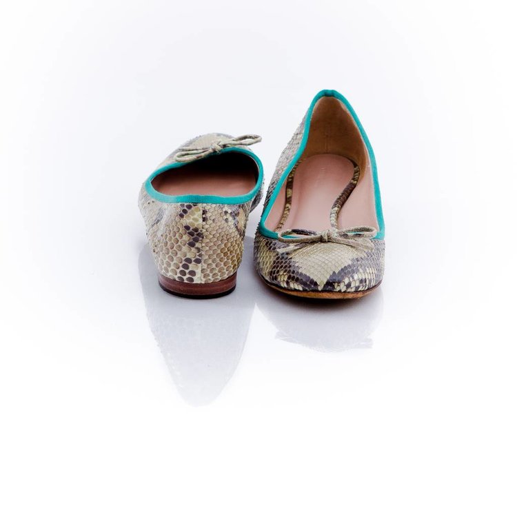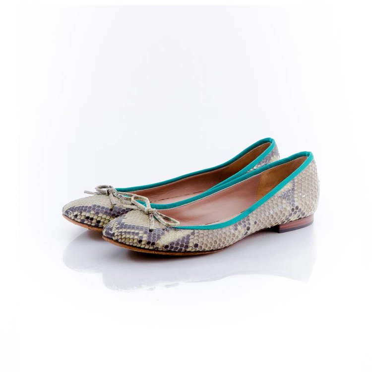 Céline, natural-colored ballerina with grass green finishing details.