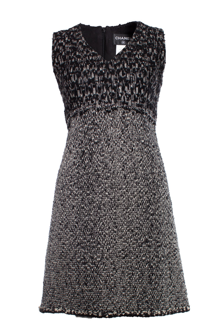 Chanel, Black and white sleeveless boucle dress. The item has been worn but is in good condition. Some pulls visible on the material. (The item can be purchased with a matching jacket.)