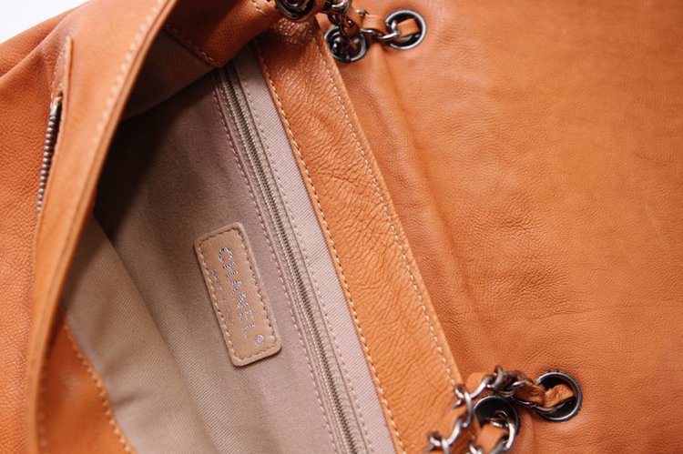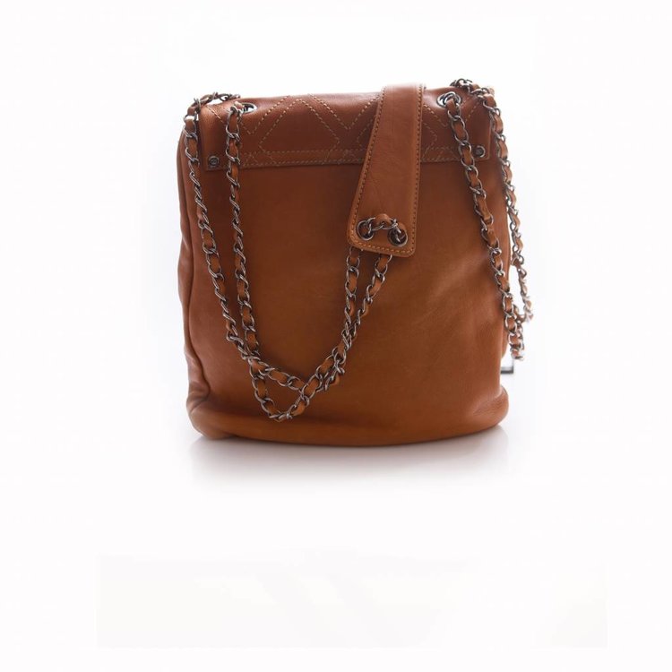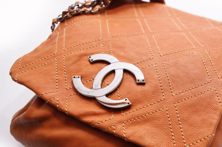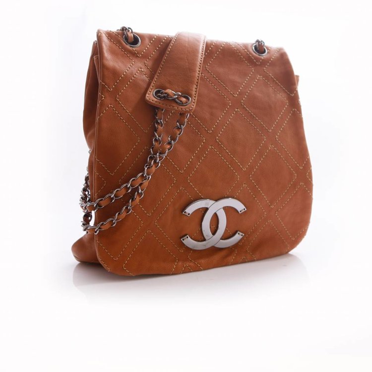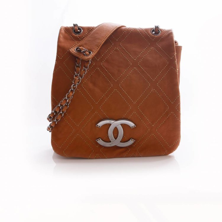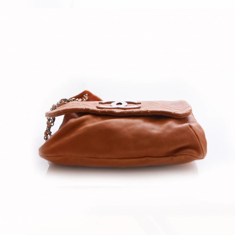 • Cognac coloured diamond-quilted Caviar leather Chanel messenger with gunmetal hardware, single shoulder strap with woven chain-link detail, single concealed zip pocket at front, cognac woven lining, single zip pocket and flap closure at front.