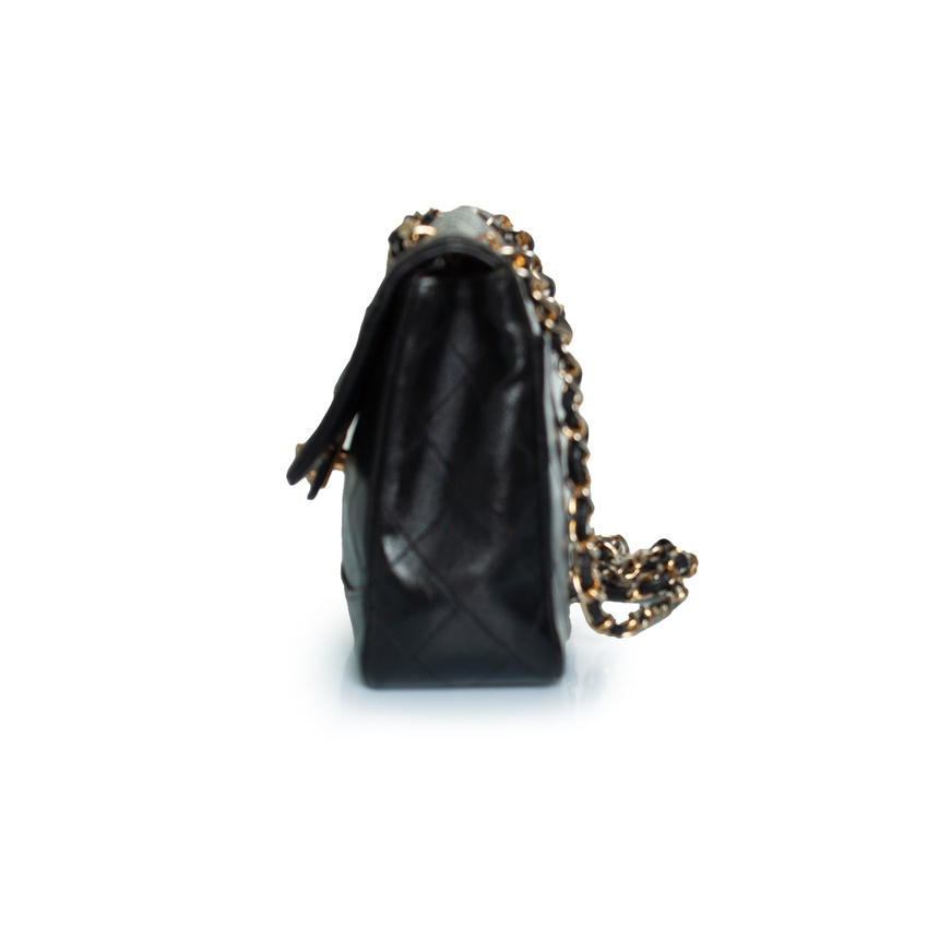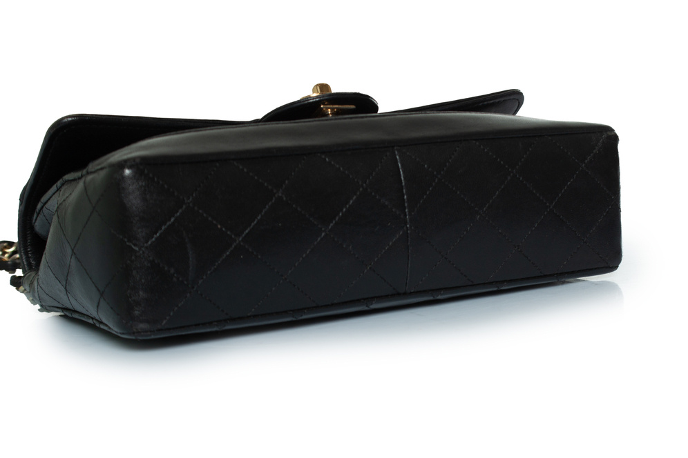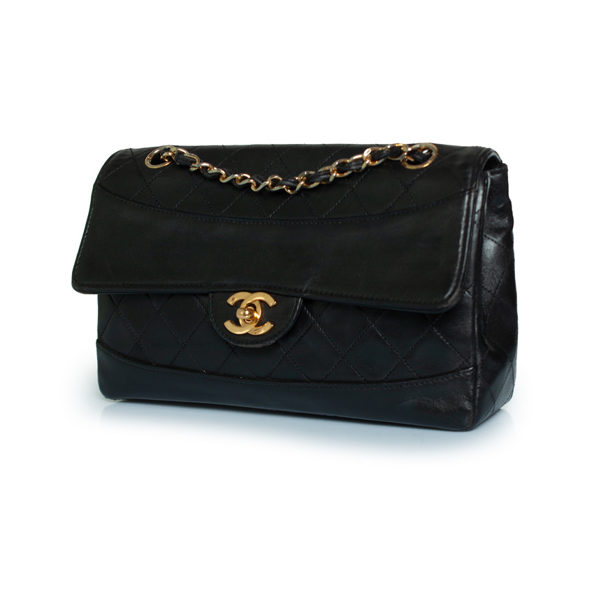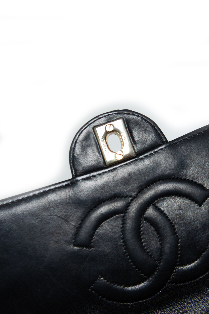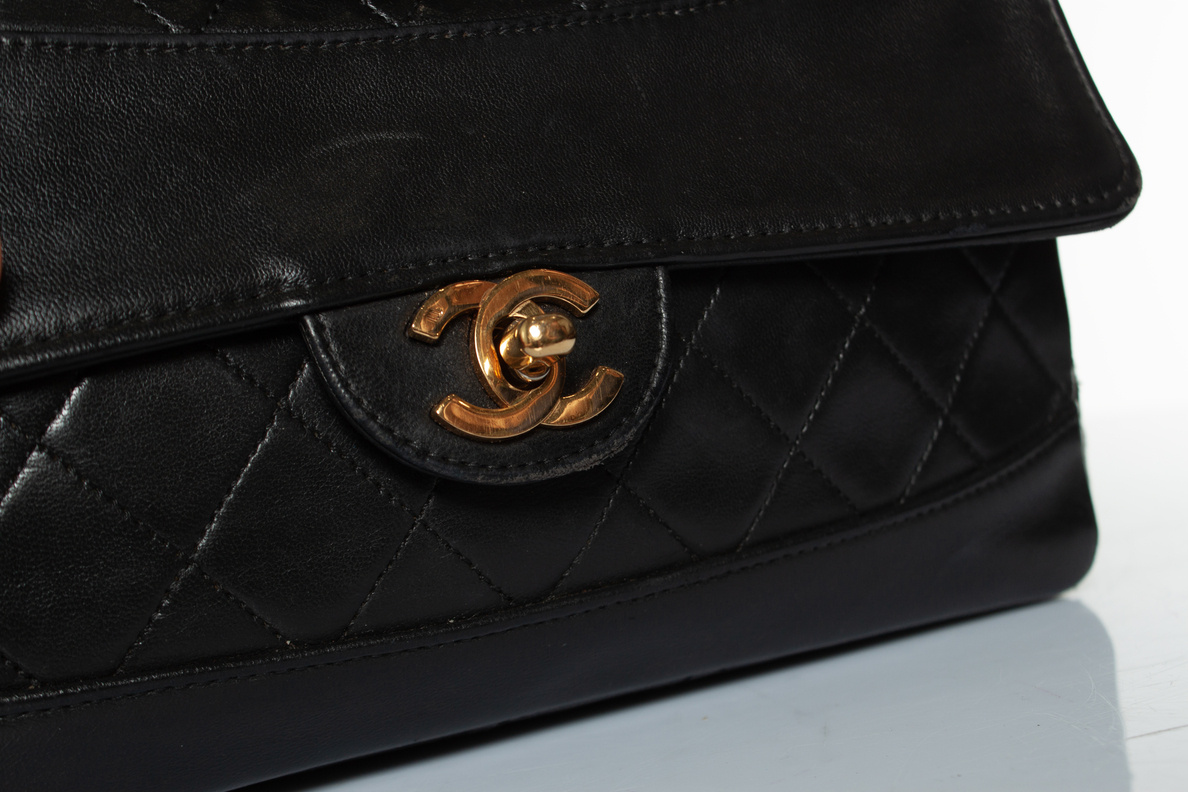 Chanel, Classic flap bag in black. This piece has discoloration in the shoulder chain and one of the corners shows some wear further the item is in good vintage condition. Comes with d