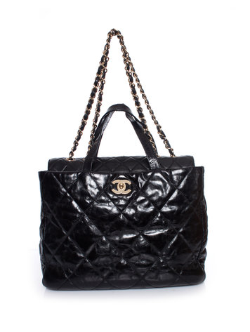 This stunning tote is crafted of glazed Portobello black calfskin diamond quilted leather. The bag features leather strap top handles, gold chain link shoulder straps threaded with leather and a frontal gold Chanel CC Mademoiselle turn lock for the leather flap closure. This opens to a black striped fabric interior with zipper and patch pockets.