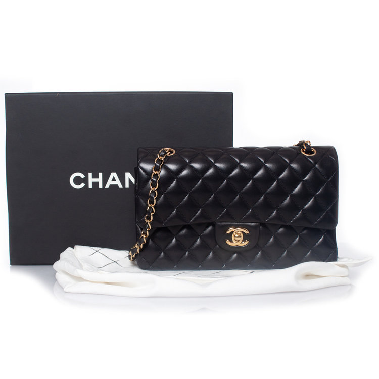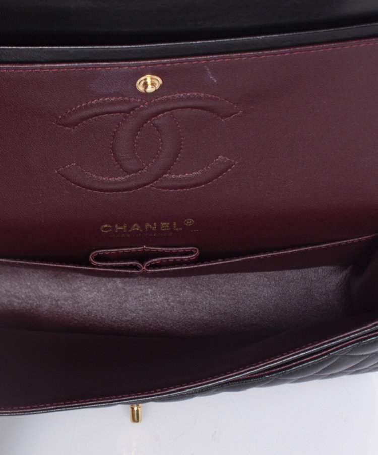 Chanel, Medium timeless in black calf leather. The item has been worn very little and is in excellent condition on exterior and interior. Item has a little scratch on the bottom, and a very light discoloration on the red flap closure. Item comes with box, dustbag, authenticity code and receipt.• CONDITION: very good condition