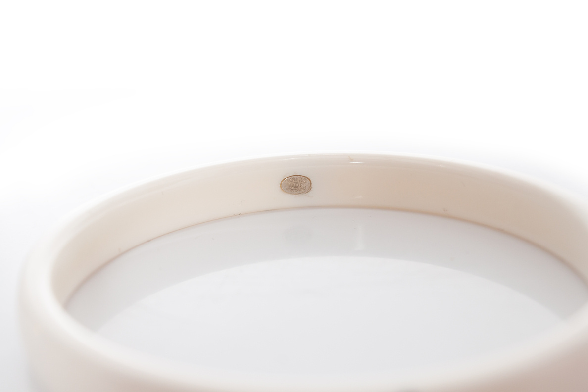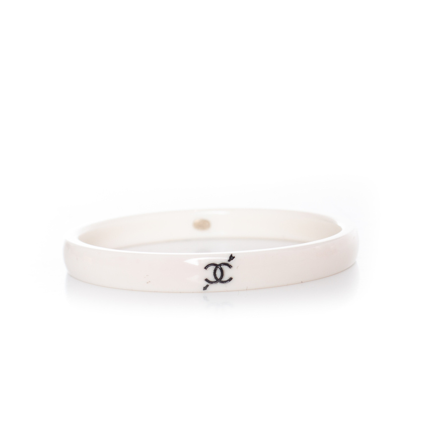• Chanel, plastic white bangle with heart and logo. The item is in good condition.