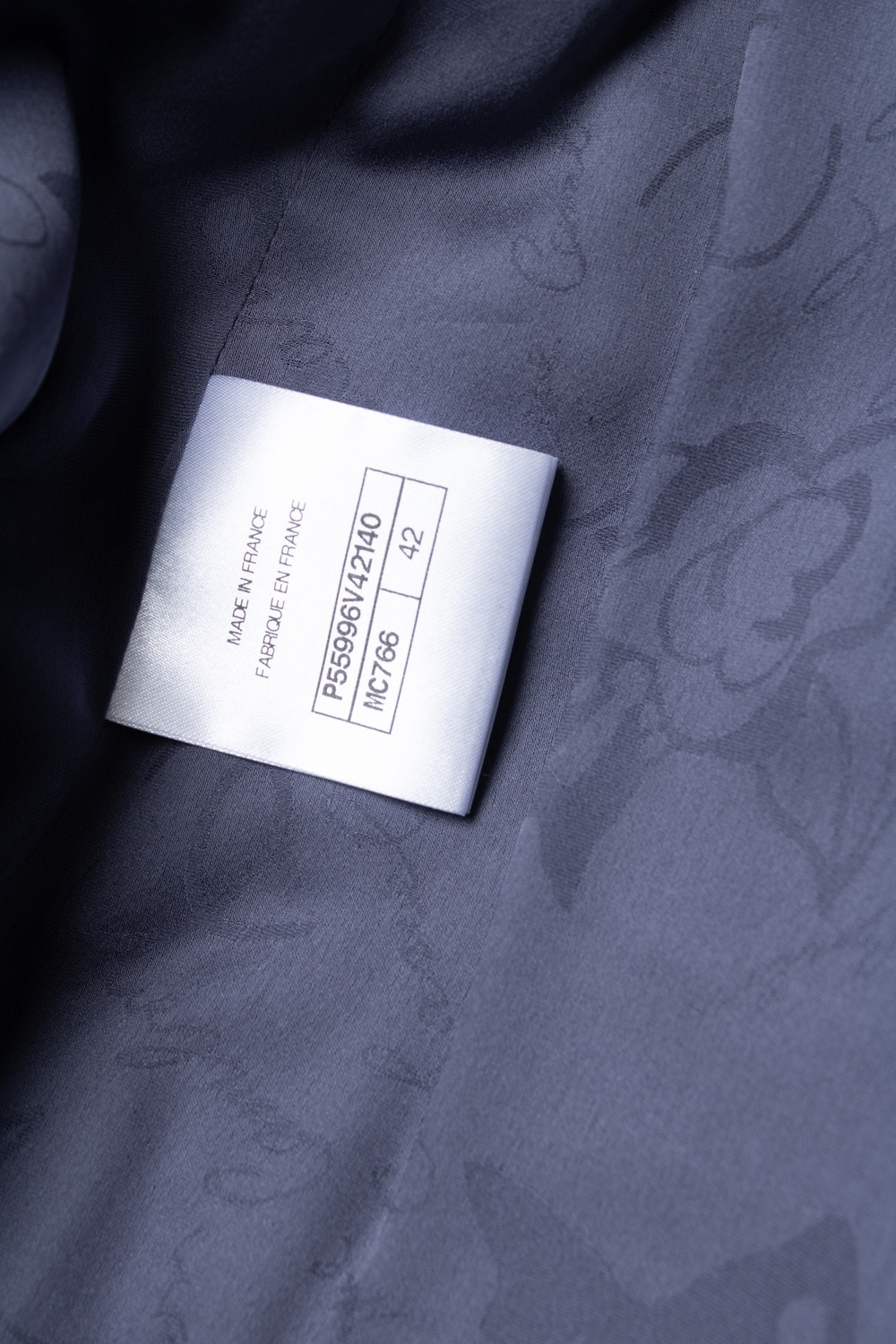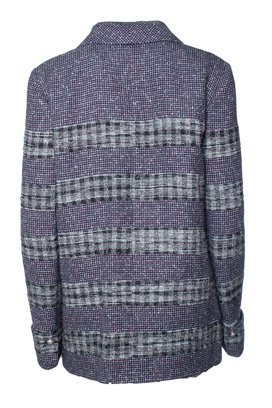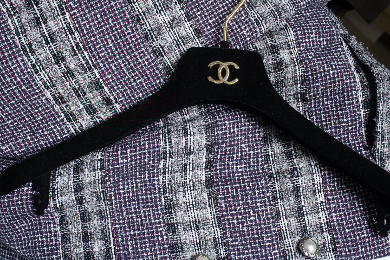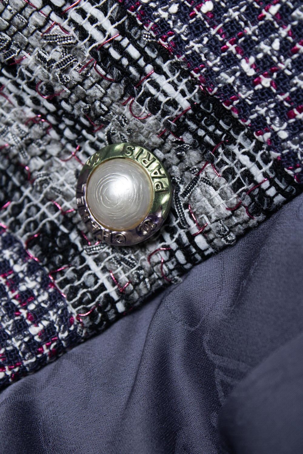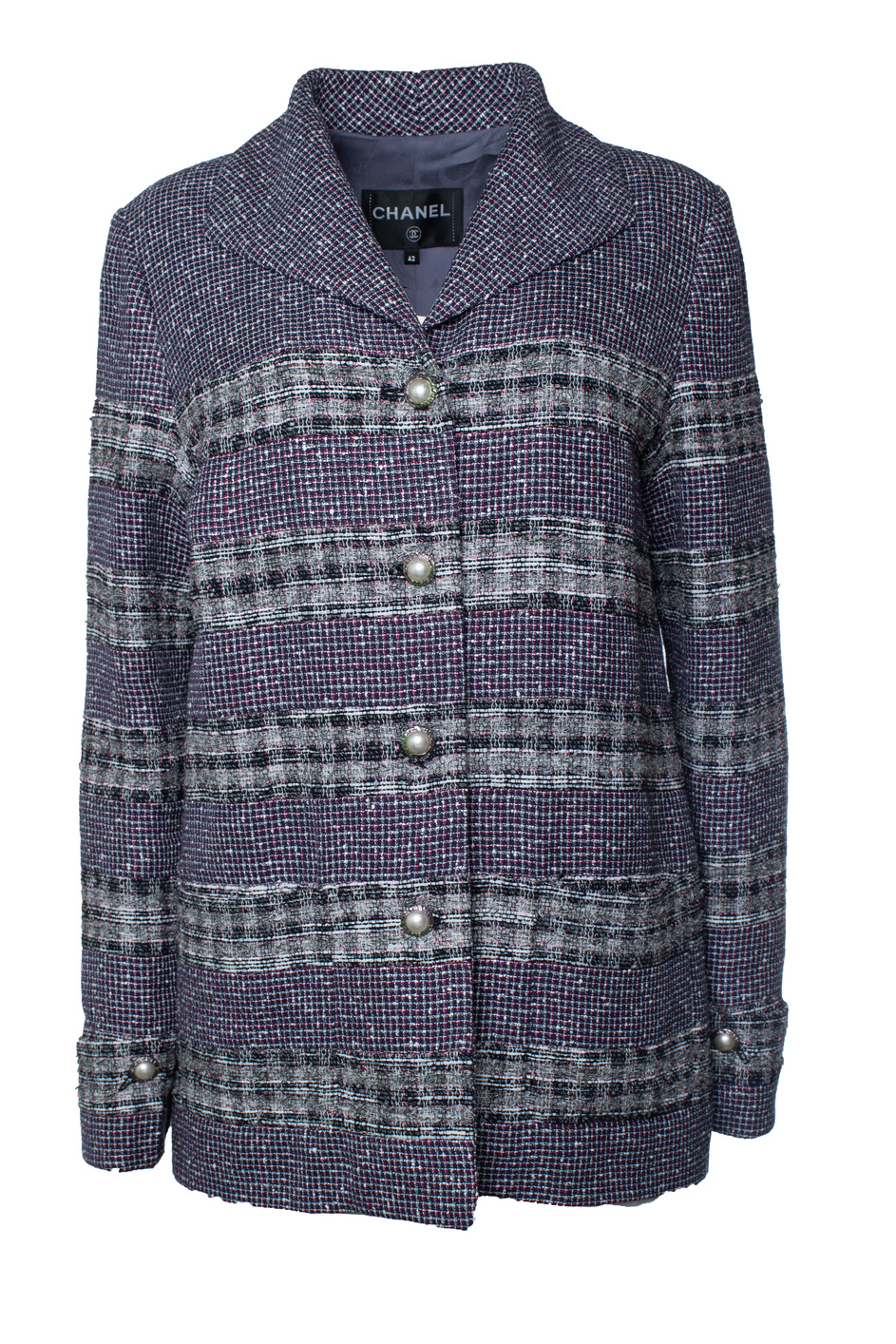 • Chanel, purple tweed blazer with lurex and multicoloured mother of pearl buttons. The item is in very good condition and comes with 2 extra buttons and chanel hanger.