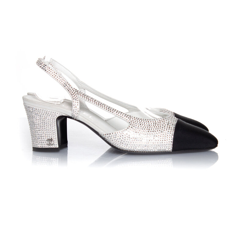 • Chanel, slingback heels in rhinestones. The item has been worn once inside and is in excellent condition. Comes with box, dustbag and booklets.