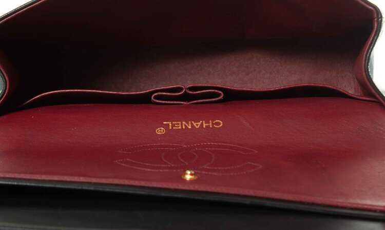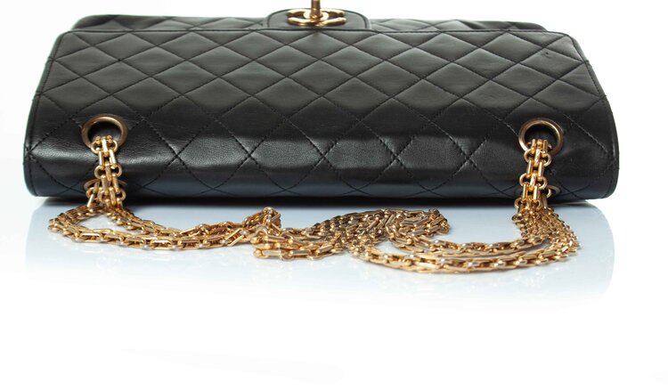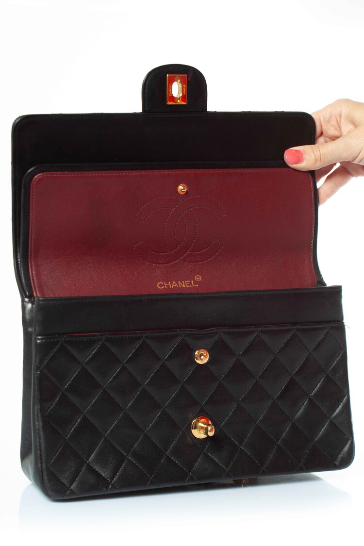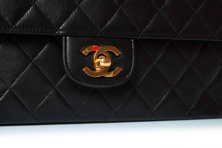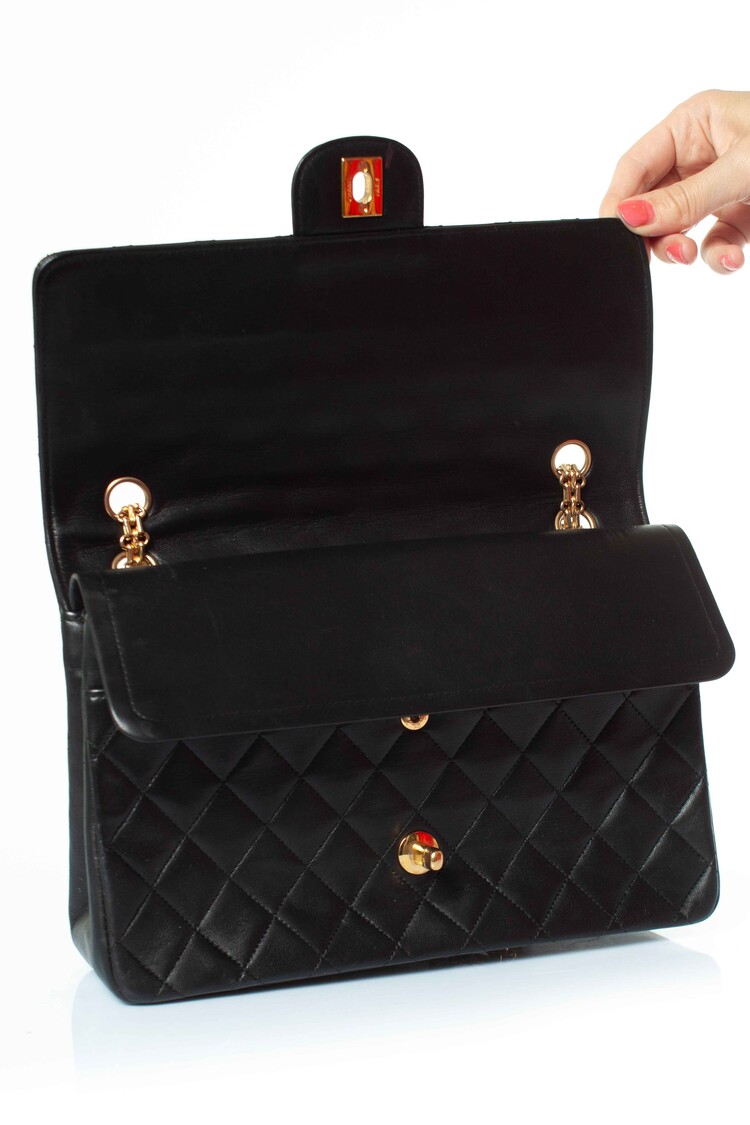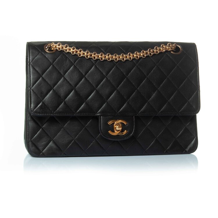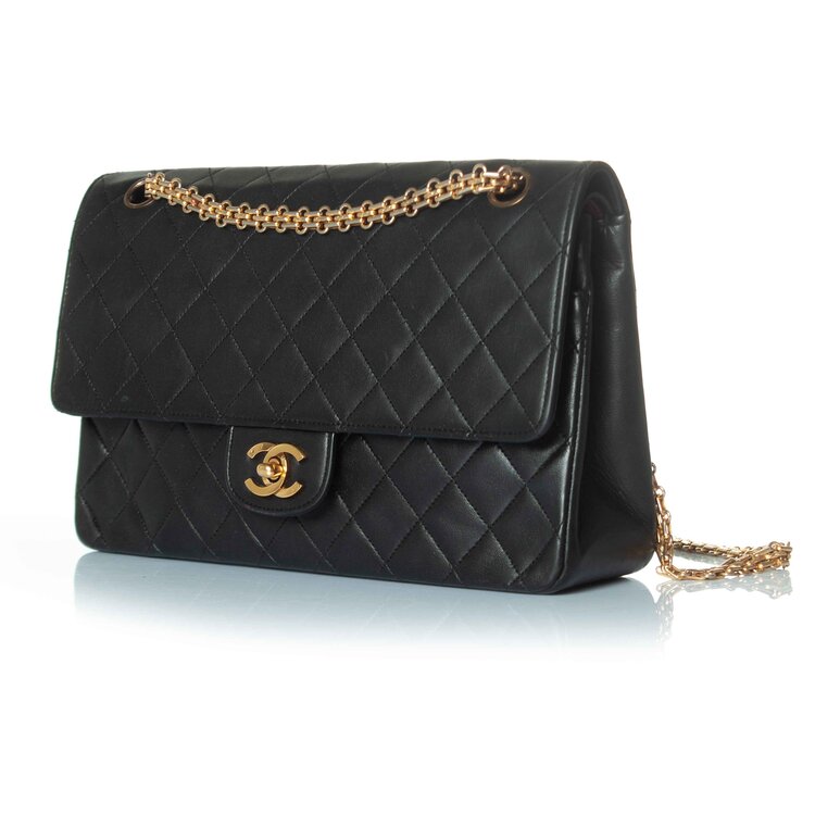 Chanel, Timeless quilted leather shoulder bag with 24k gold hardware. Item is in good condition. Small spots on the front flap. Interior in very good condition. Comes with authenticity card, serial sticker and dustbag. Corners have had a spa treatment.