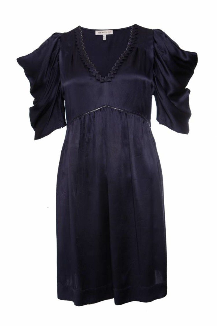 Chloe, blue silk dress with short open fluttered sleeves in size I42/S. This product has been worn only 2 or 3 times and is still in excellent condition.