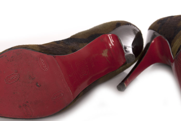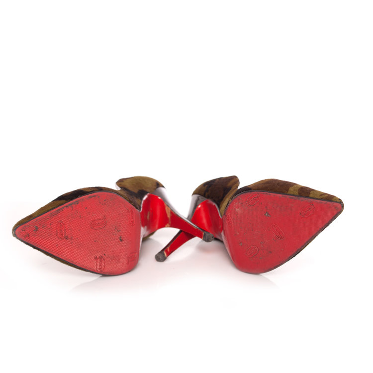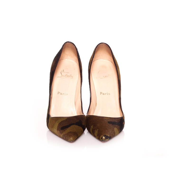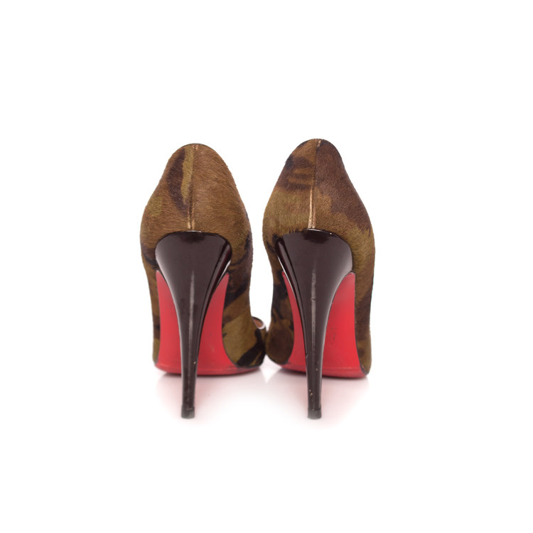 • Christian Louboutin, Green army print pumps in calf hair with patent leather heel in size 39.5. The item is reinforced under the sole and has slight damage on both heels and the tip of the nose, further in good condition.