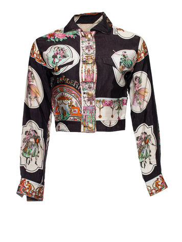 Gianni Versace couture, jacket with ballerina print and gold medusa buttons. The item has light discoloration but overall condition is good. The item is missing one button on the sleeve.
