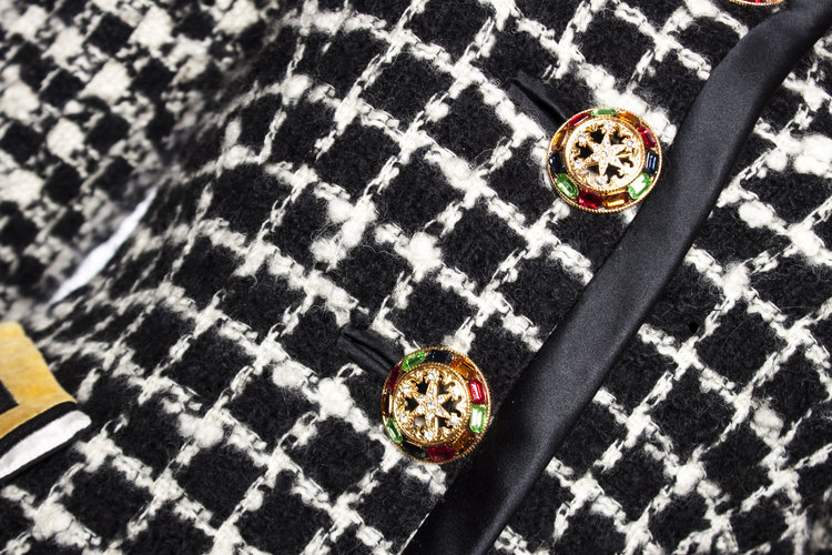 • Gianni Versace Couture, Black and white boucle jacket. This Vintage piece features colourful crystal buttons and 2 stitch pockets with velvet print. The item is in very good condition, only the velvet on the pockets shows some light discoloration