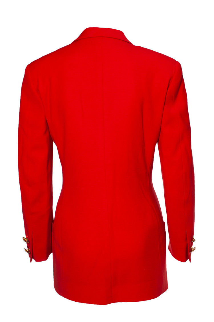 Gianni Versace Couture, Bondage collection runway red blazer. The item is in good condition with very small stains on the fabric (front bottom and elbow). Most of the stains are covered under the buttons. (FW1992)