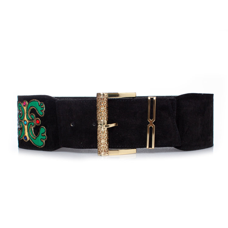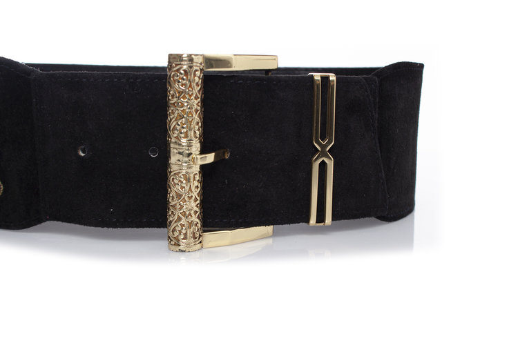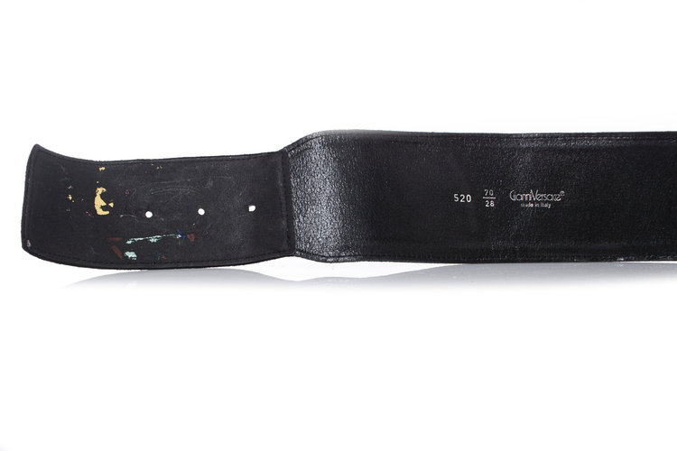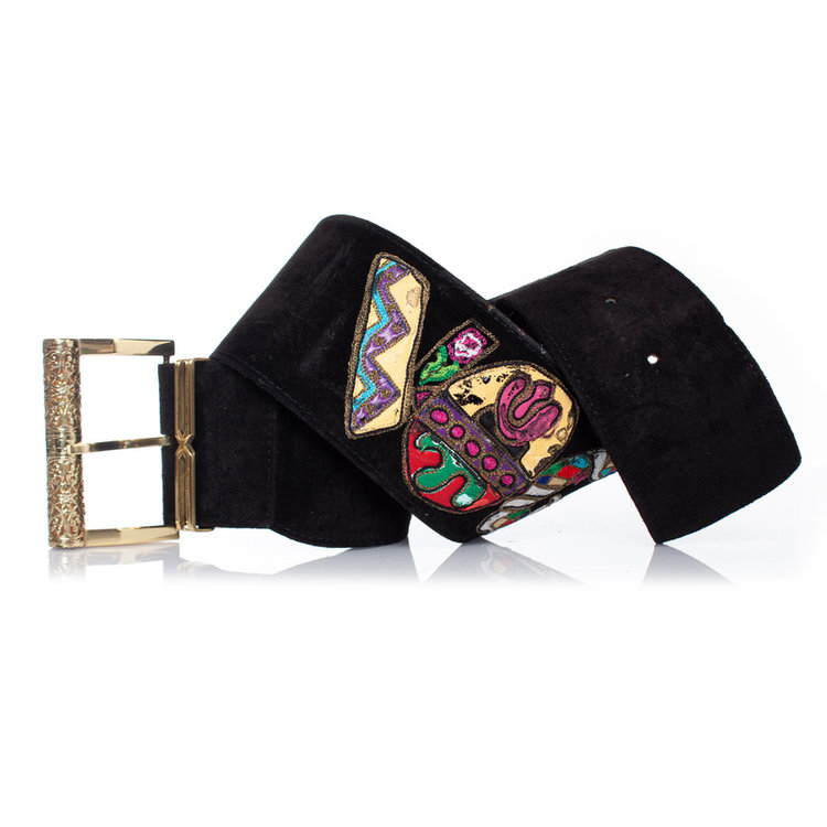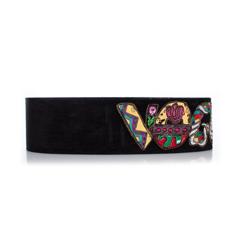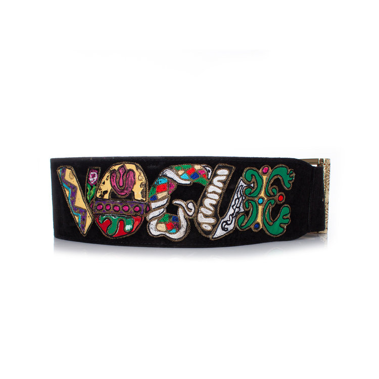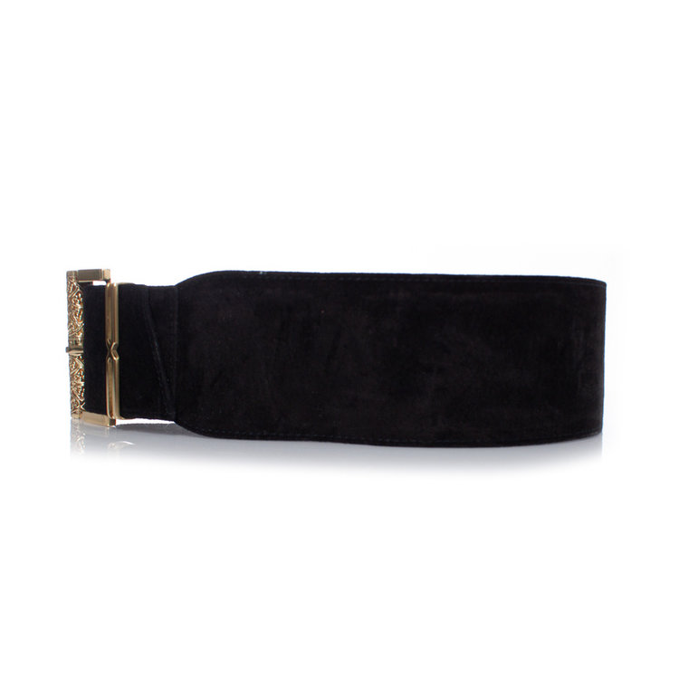 • Gianni Versace, Runway Vogue belt in black suede. The item is in good condition with light peeling on the letters. Hardware is in very good condition. Very rare vintage piece. ( Couture runway show 1991)