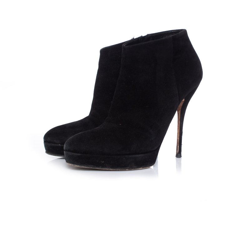 • Gucci, Black suede platform ankle boots. The item has signs of wear on the suede and some scratches on the heel and is in fair condition.