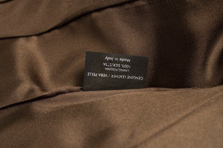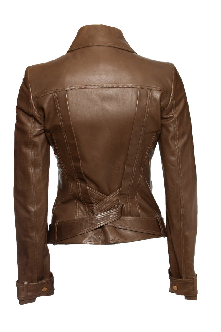 Gucci, Khaki leather biker jacket with bamboo belt and corset closure on the back. The item has gold hardware. The jacket shows very light signs of use but is otherwise in very good condition.