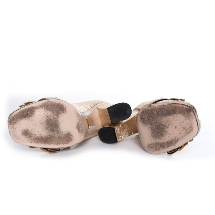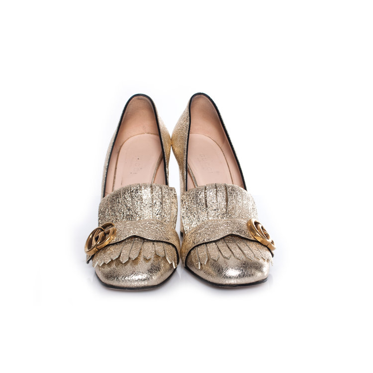 Gucci, Metallic gold foil leather GG marmont fringed loafer heels in size 37.5. This item is in very good condition and comes with the original box and dustbag.