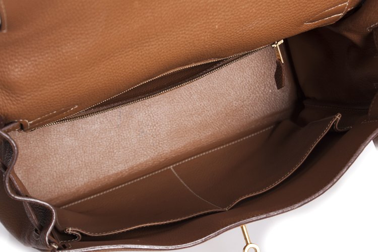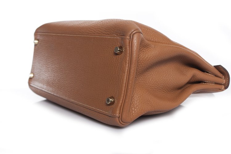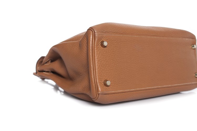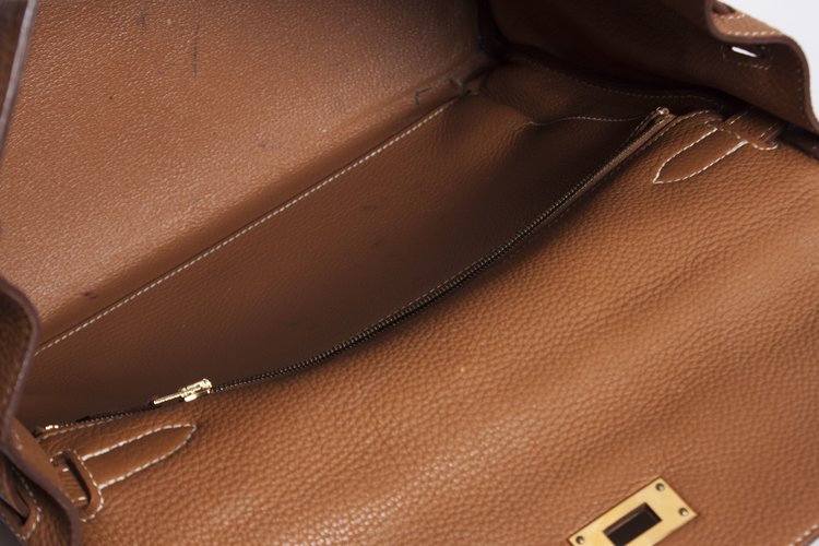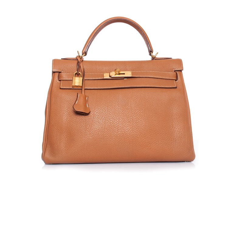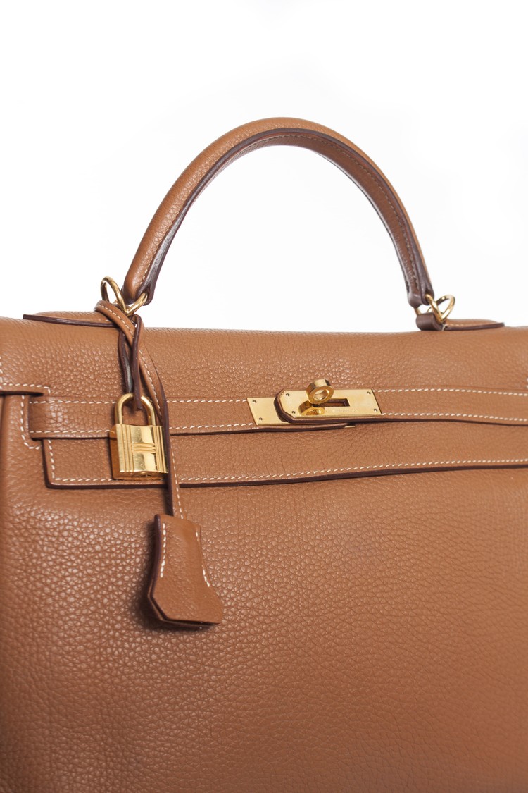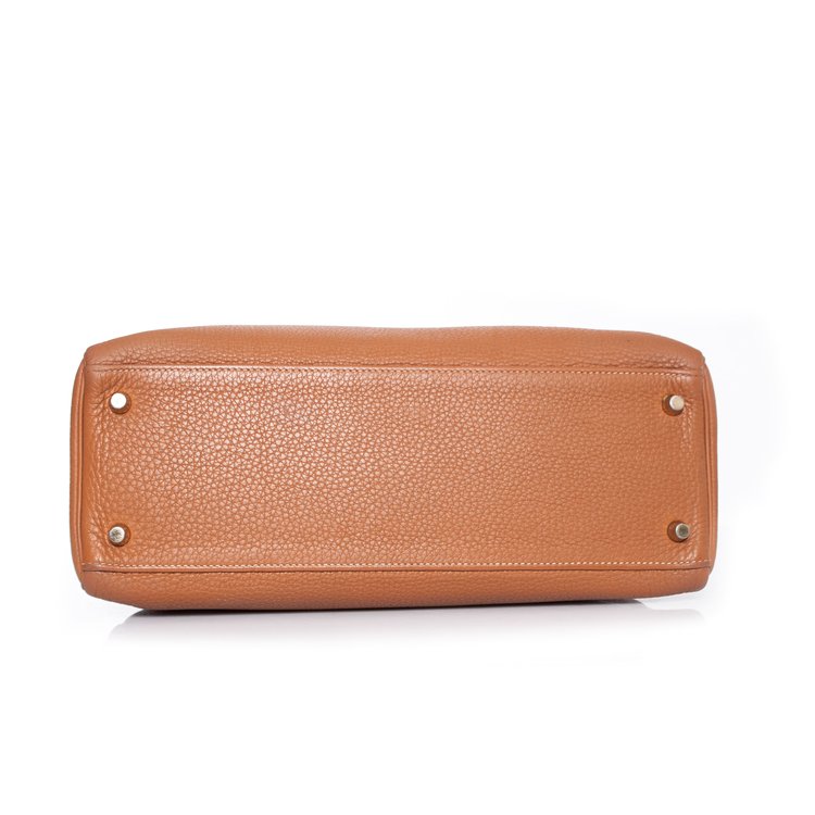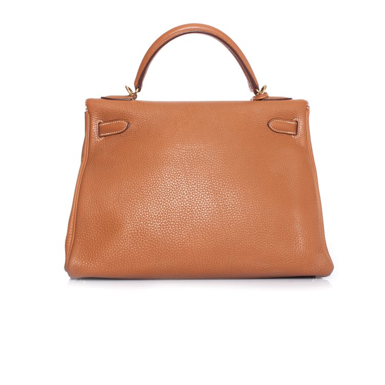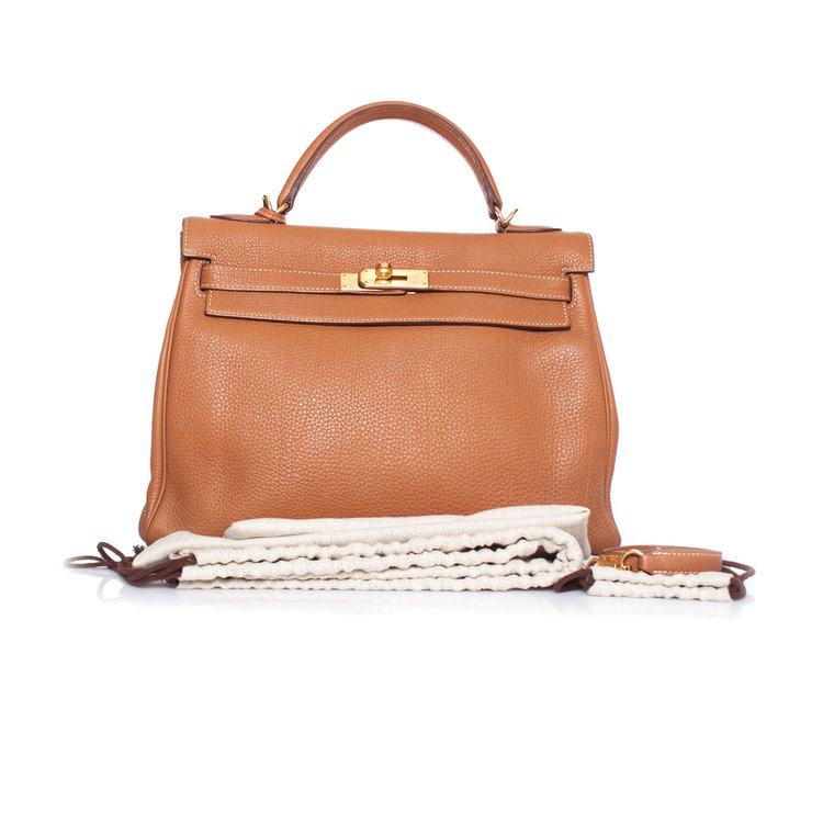 Hermes, Togo Kelly Retourne 32 Gold. This piece in in good condition with some scratches on the hardware. Corners recently had a spa treatment. Interior has a few small pen striped further in very good condition. Comes with dustbag and shoulder strap. (20