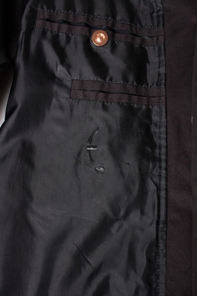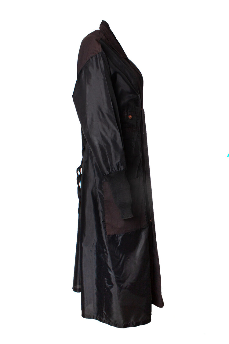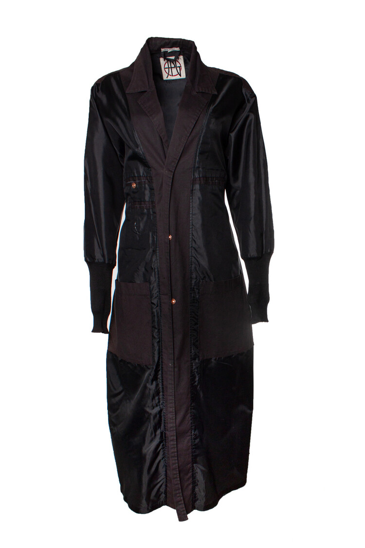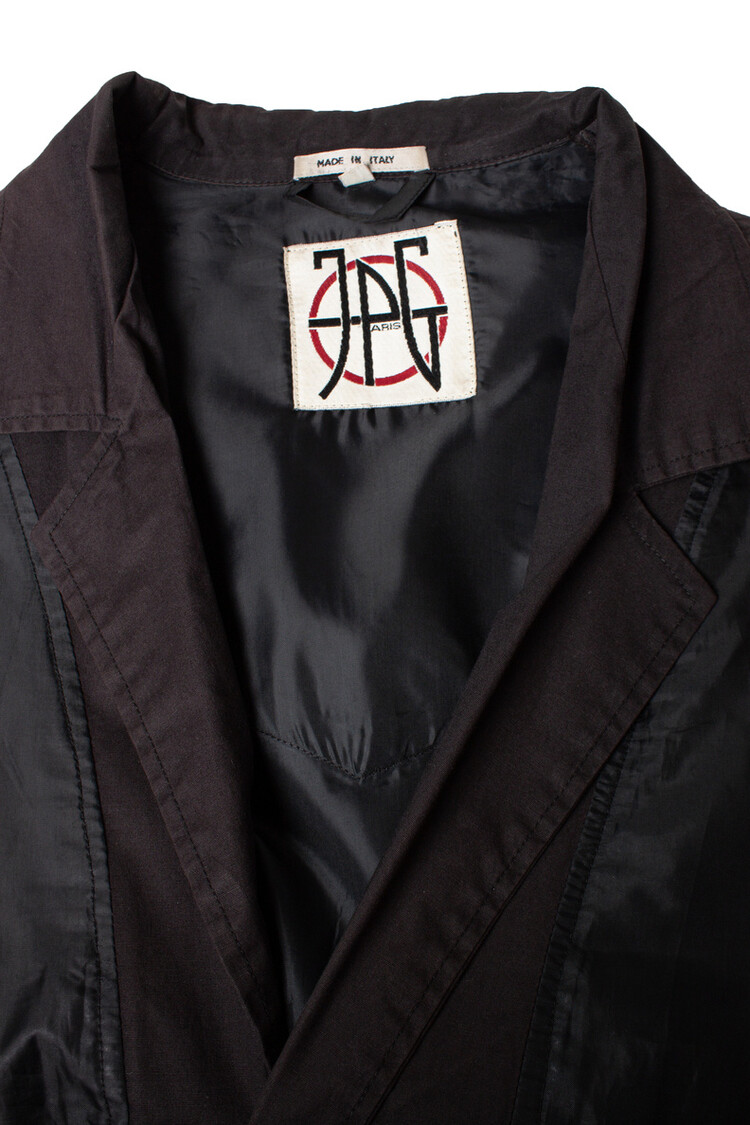 Jean Paul Gaultier, see through overcoat with press buttons and oversize pockets. The item is in good condition with a faded logo above the right pocket. Item has wear on the revert and on the fabric of the coat (pulls and wrinkles).