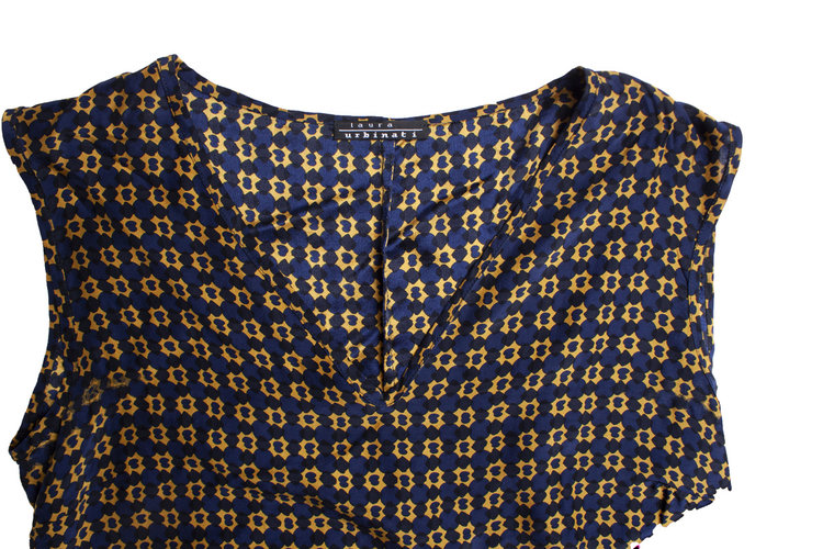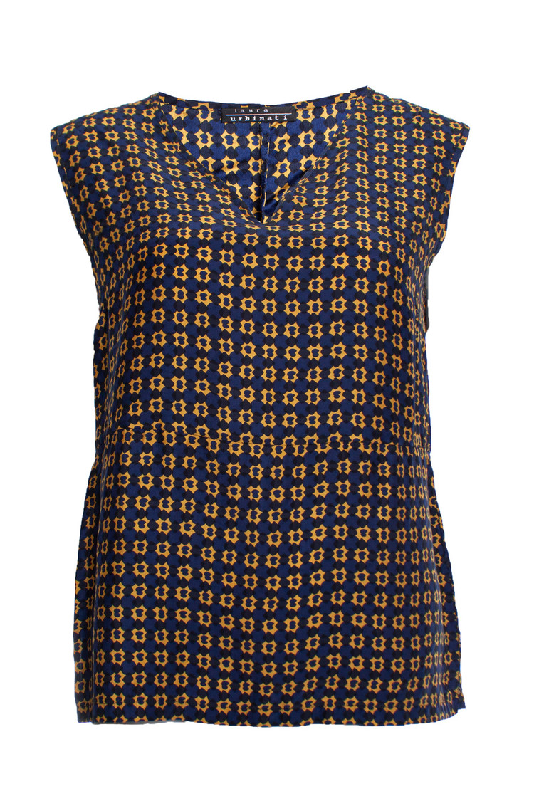• Laura Urbinati, Sleeveless top with graphical print in yellow and blue. The item is in very good condition.