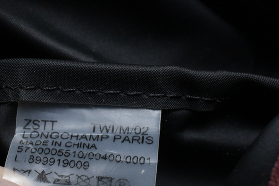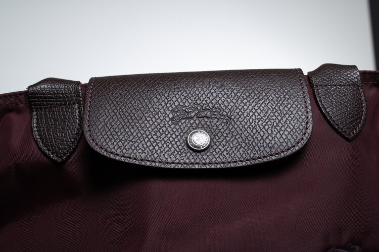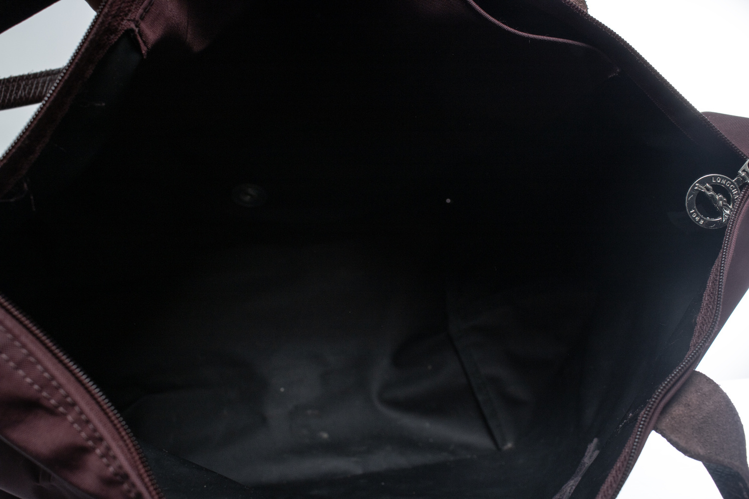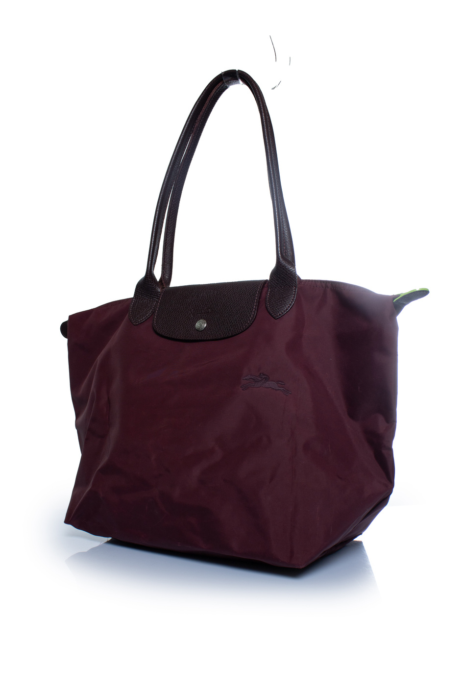 • Longchamp, Le Pliage tote in burgundy. The item has signs of wear on the corners and some stains on the bottom.