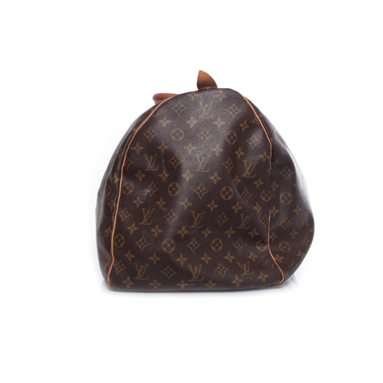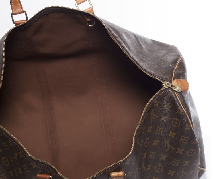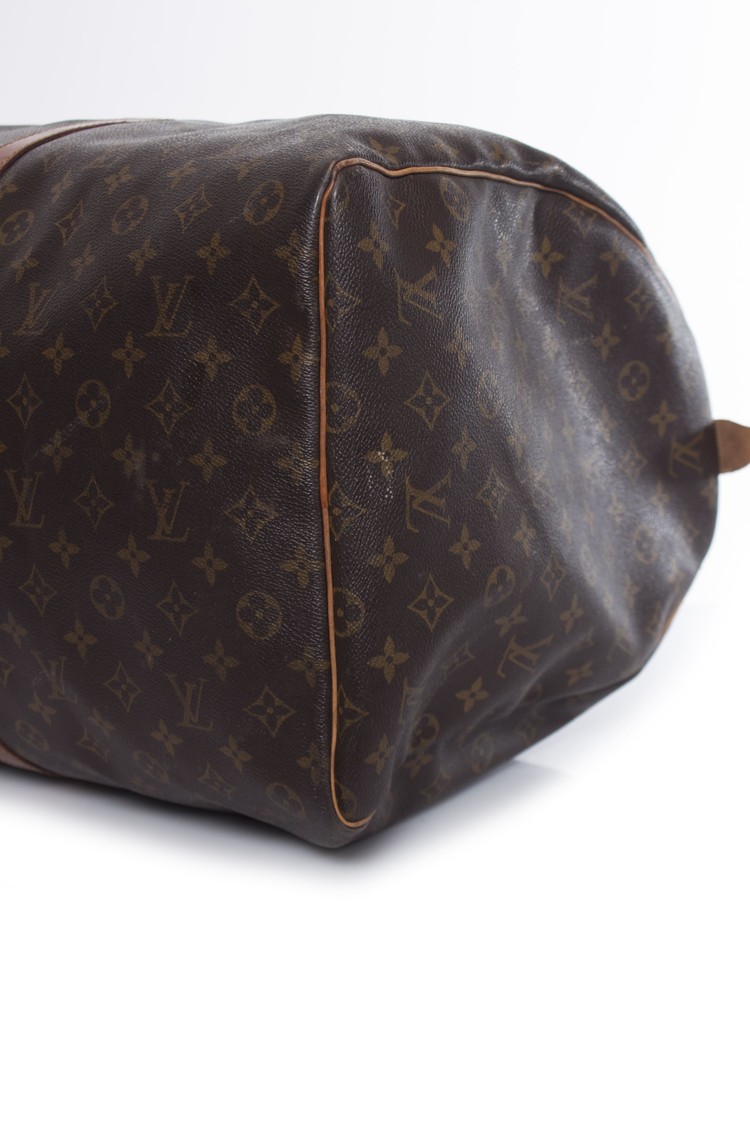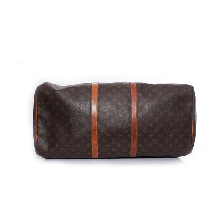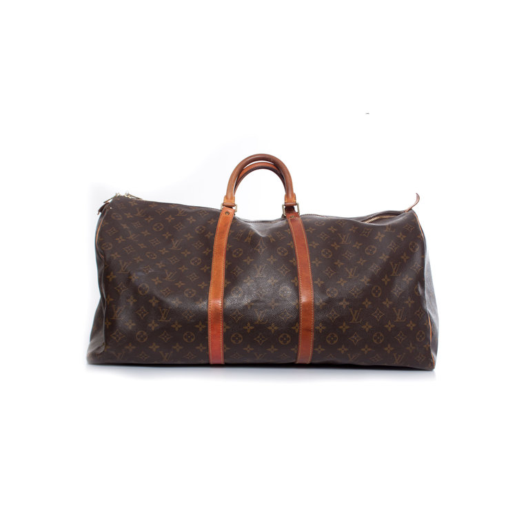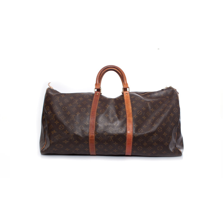 Louis Vuitton, Keepall in brown monogram canvas. The interior of the item is in very good condition, The exterior is in vintage - used condition with some discolouration on the leather and a slight damaged leather brand tab.