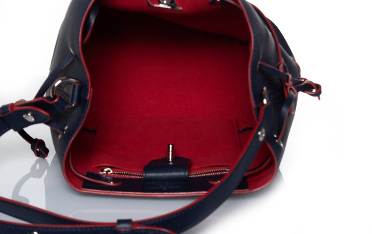 • Louis Vuitton, lock bucket bag in navy and red. The item is in very good condition. Interior also very clean. LV still has a protective sticker. Comes with dustbag.