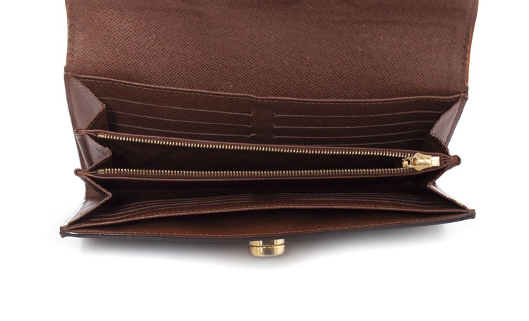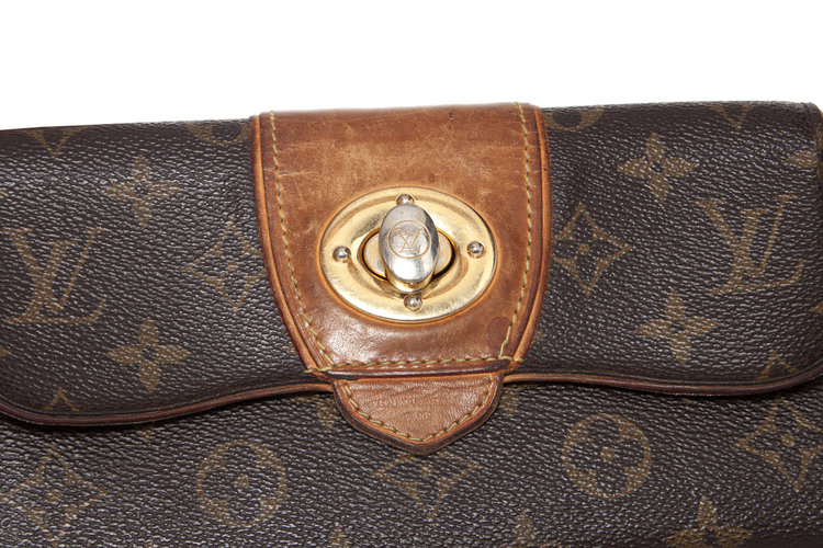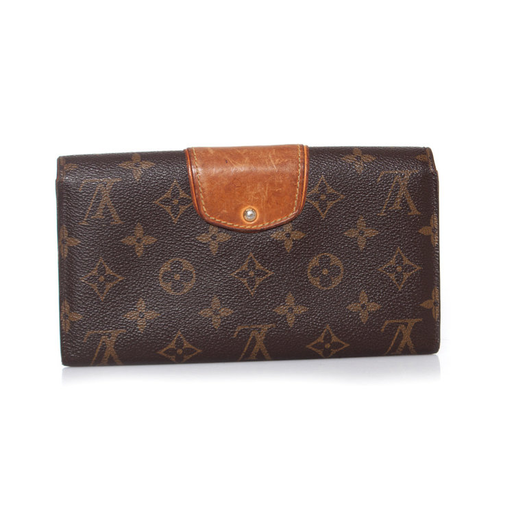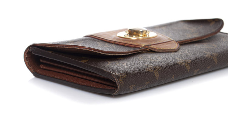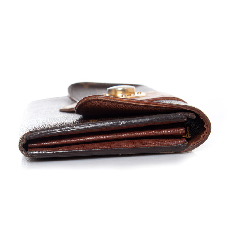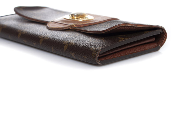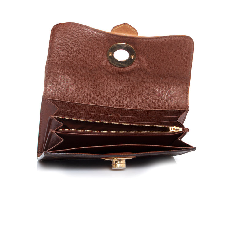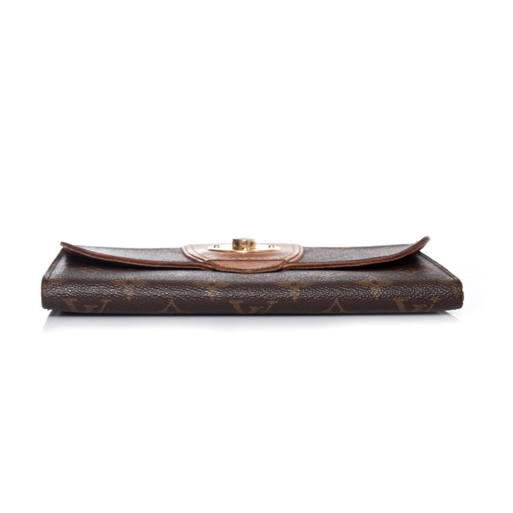 • Louis Vuitton, monogram bowtie wallet. Turnlock of the item has discolored into silver and corners show wear. Inside of the item is in good condition.