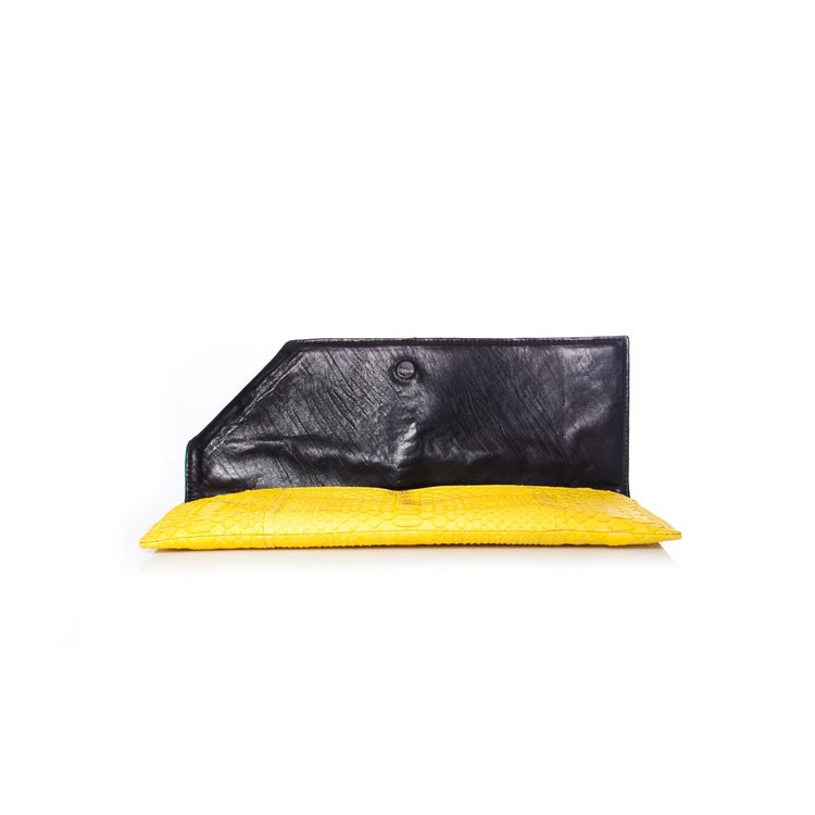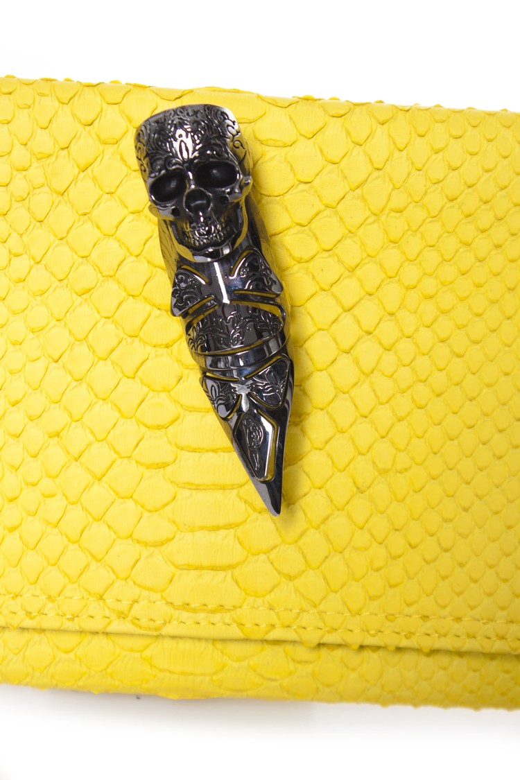 This Knuckle Ring Clutch by Maison Du Posh is crafted in beige snakeskin leather featuring a metal gun plated skull ring and a spike that embellishes the left flap corner. This features a magnetic flap closure and interior is fully lined with soft black leather and has one patch compartment inside.