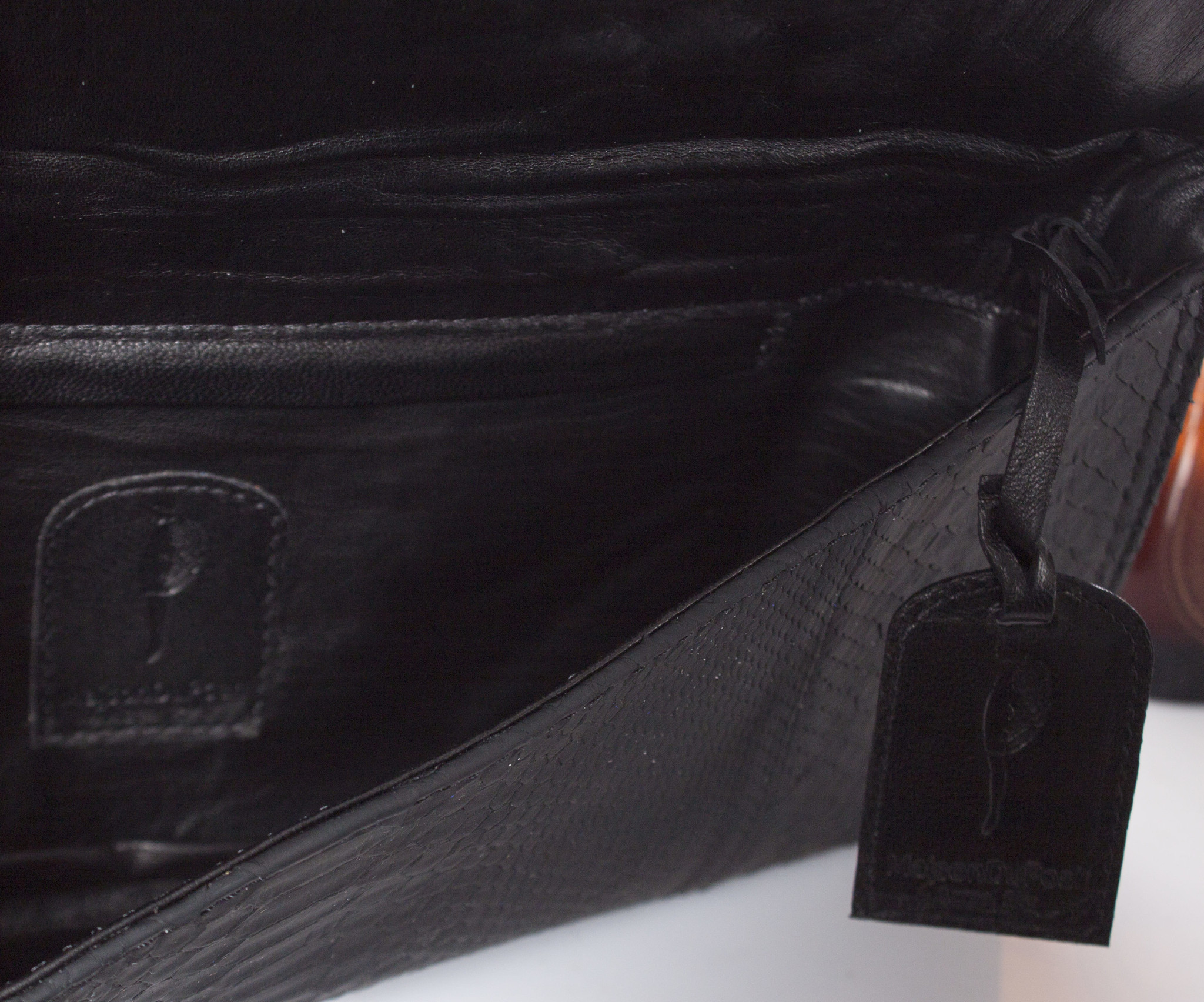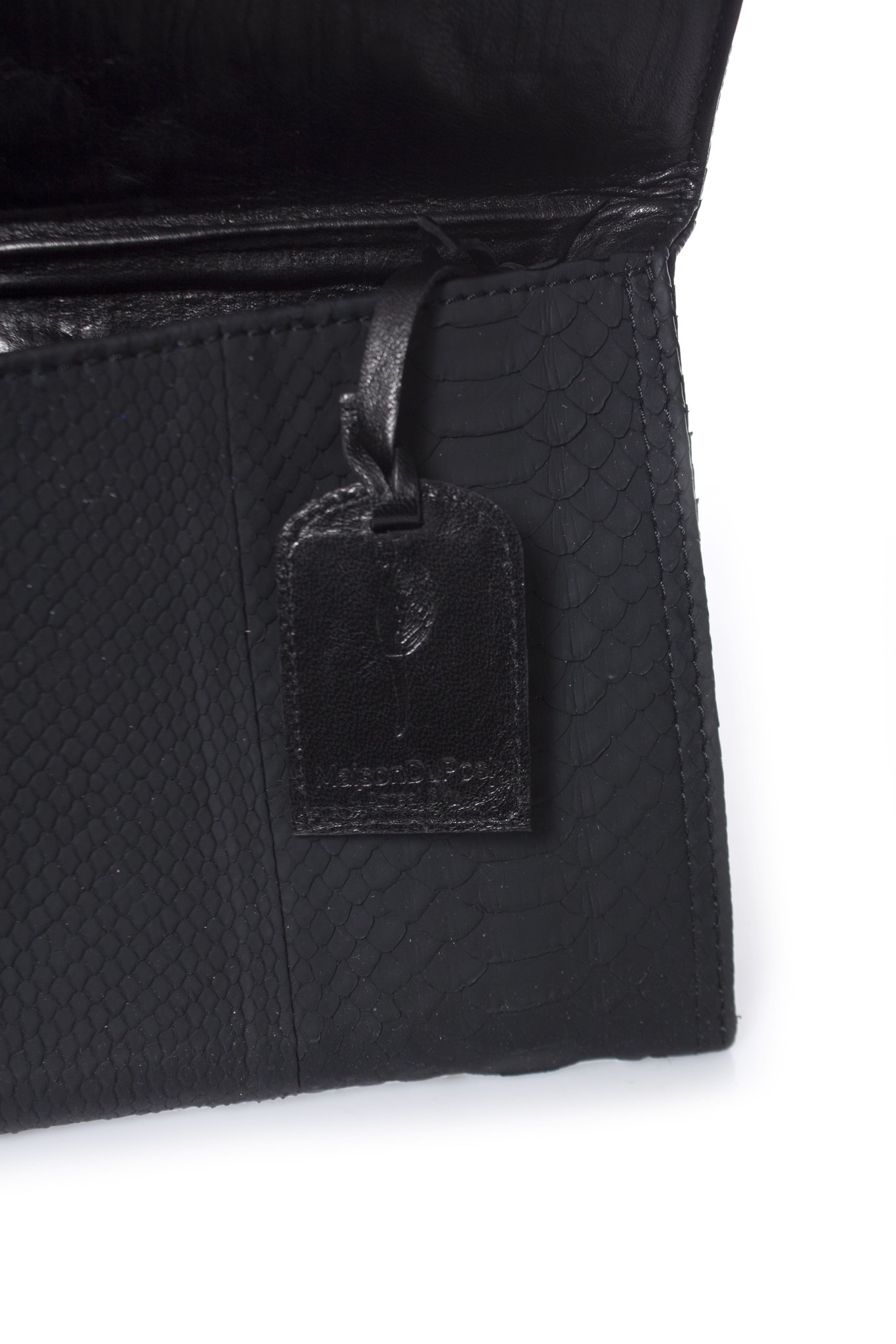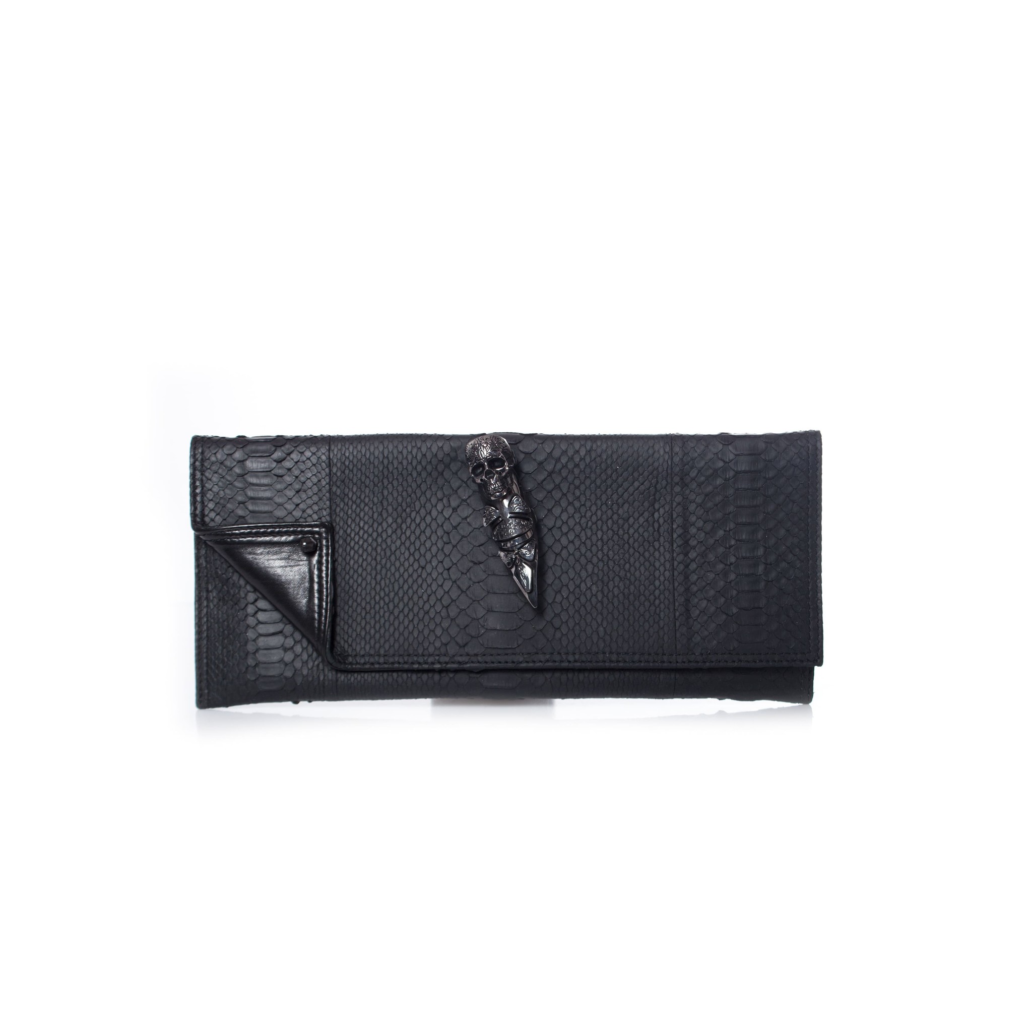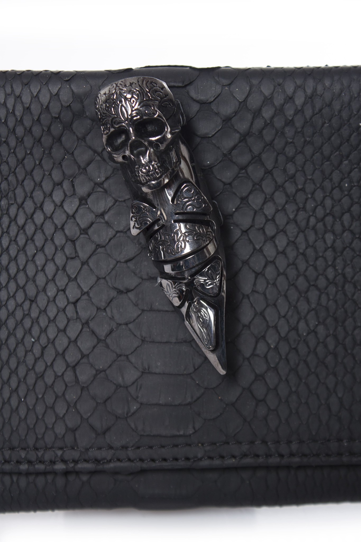 This Knuckle Ring Clutch by Maison Du Posh is crafted in black rubber coated snakeskin leather featuring a metal gun plated skull ring and a spike that embellishes the left flap corner. This features a magnetic flap closure and interior is fully lined with soft black leather and has one patch compartment inside.