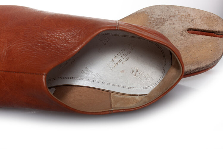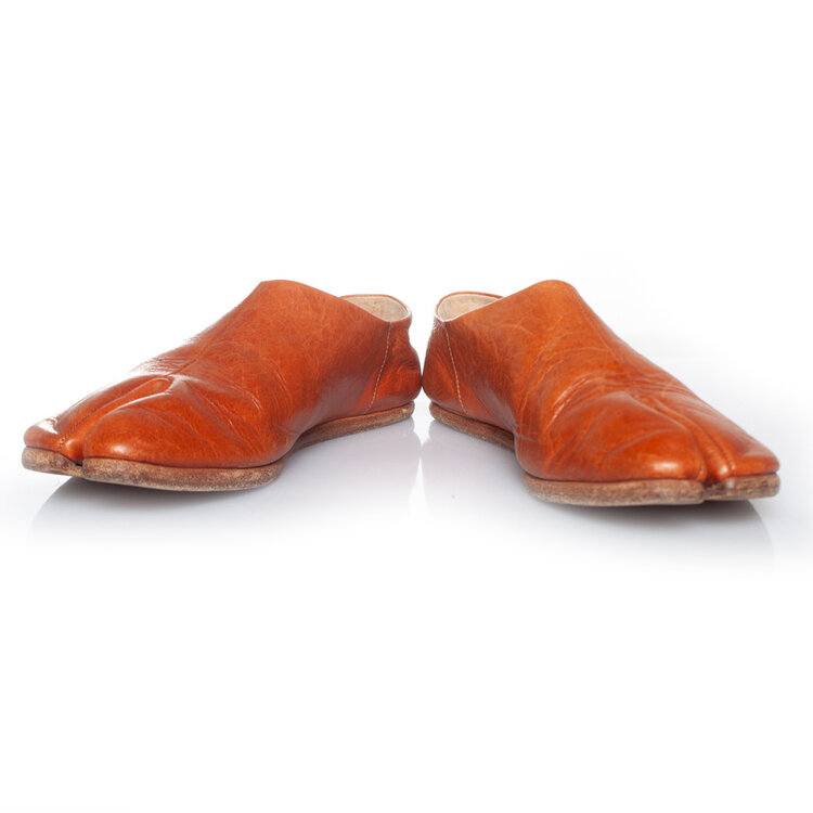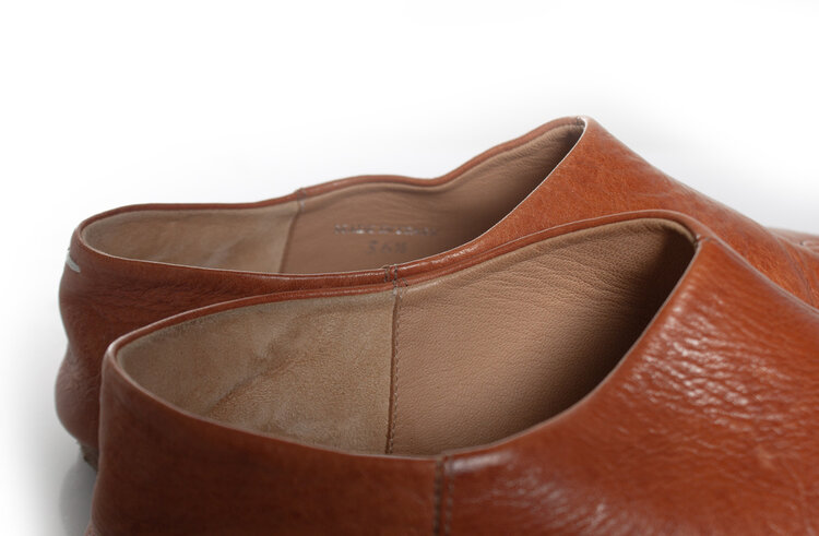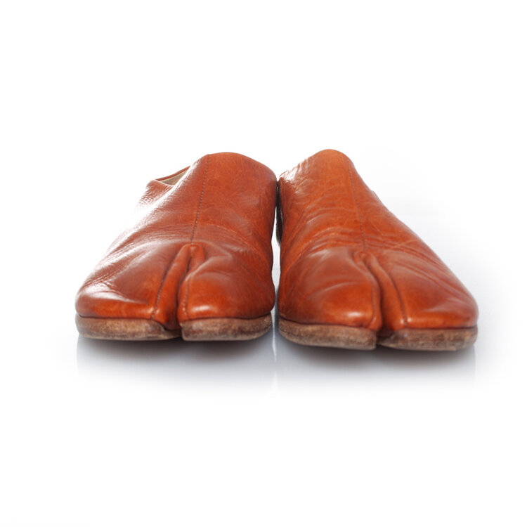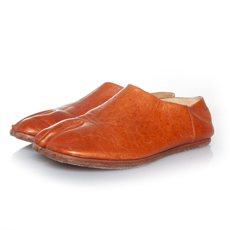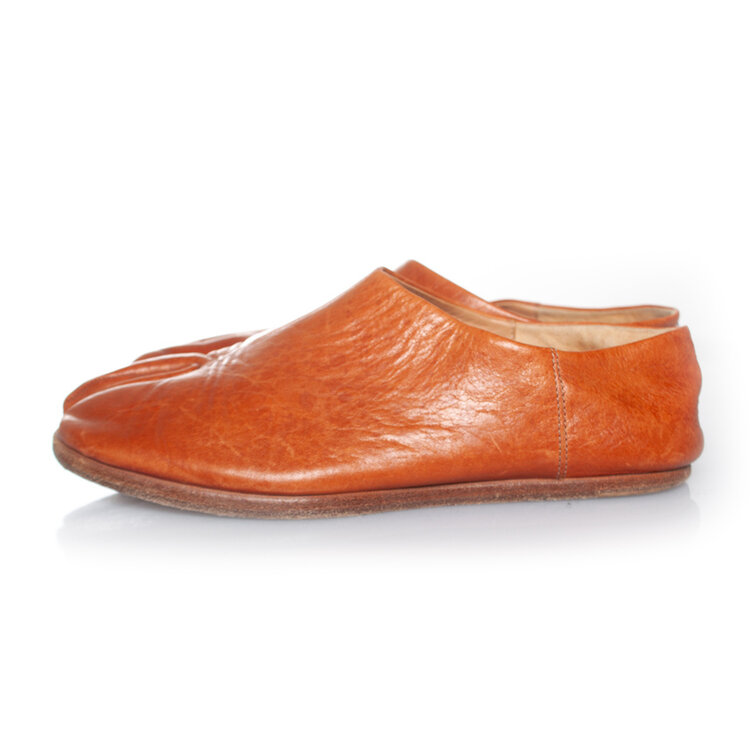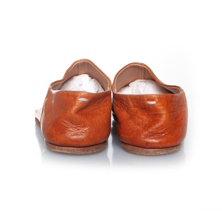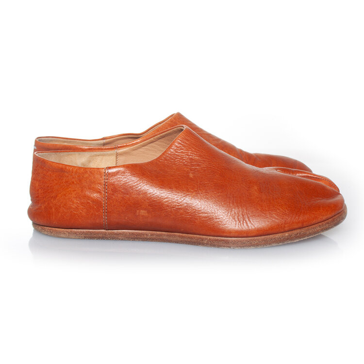 • Maison Margiela, Slip on leather toe flats in cognac. The item is in good condition. A few small scratches on the leather.