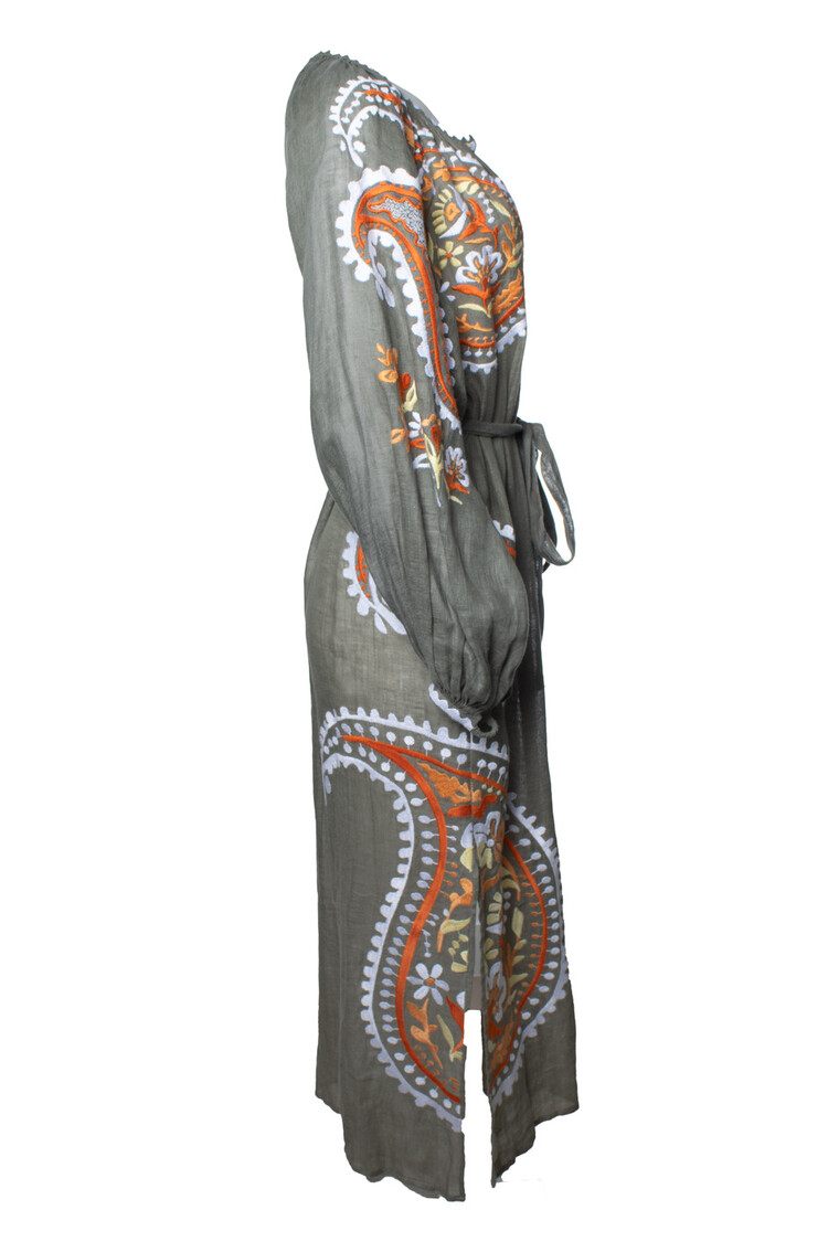 • March 11, Green embroidered maxi dress. The item is in very good condition.