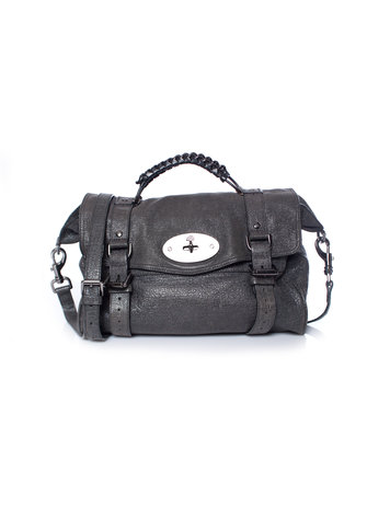 Mulberry, Metallic gunmetal Sparkle Tweed-printed leather Alexa bag with tonal hardware, single adjustable shoulder strap, single flat top handle featuring braided leather accent, black jacquard lining, dual pockets at interior walls; one with zip closure, turn-lock closure and magnetic snap closures at front flap. Includes dust bag and original receipt. Shop authentic mulberry bags at Unique Designer Pieces