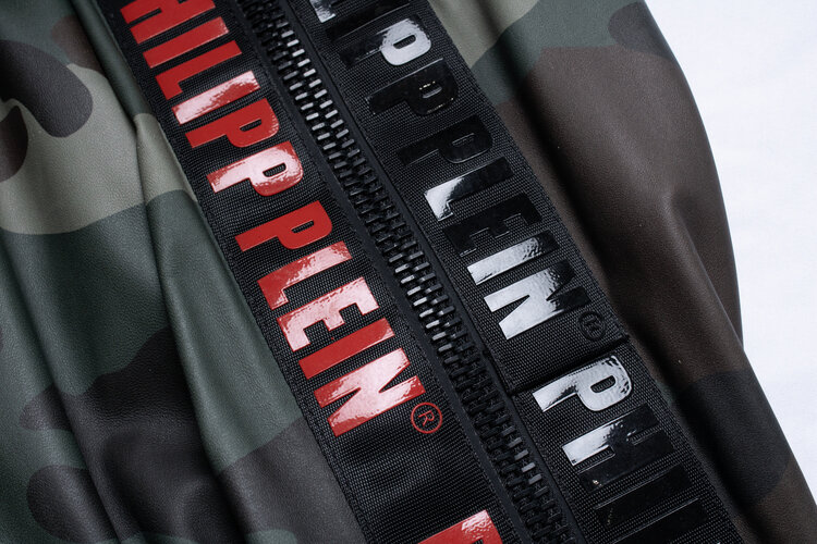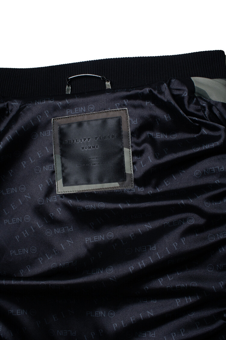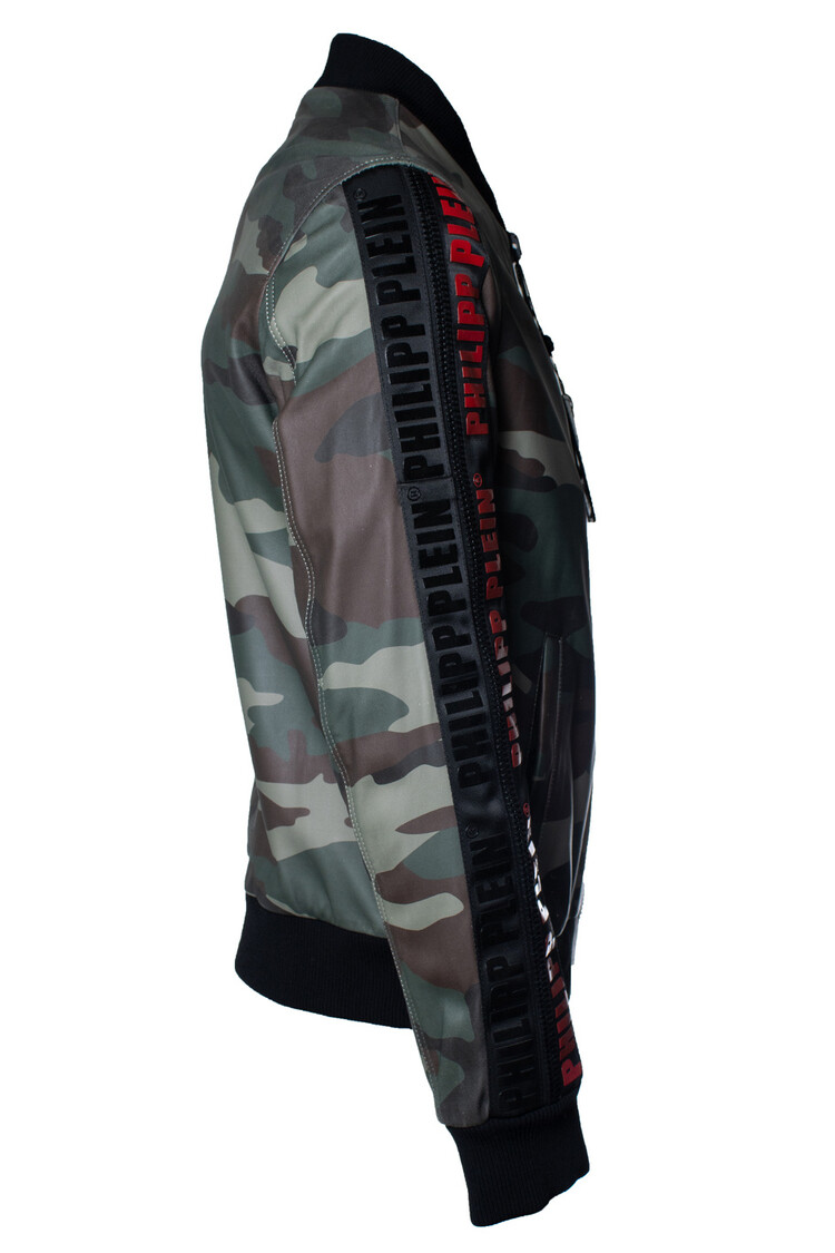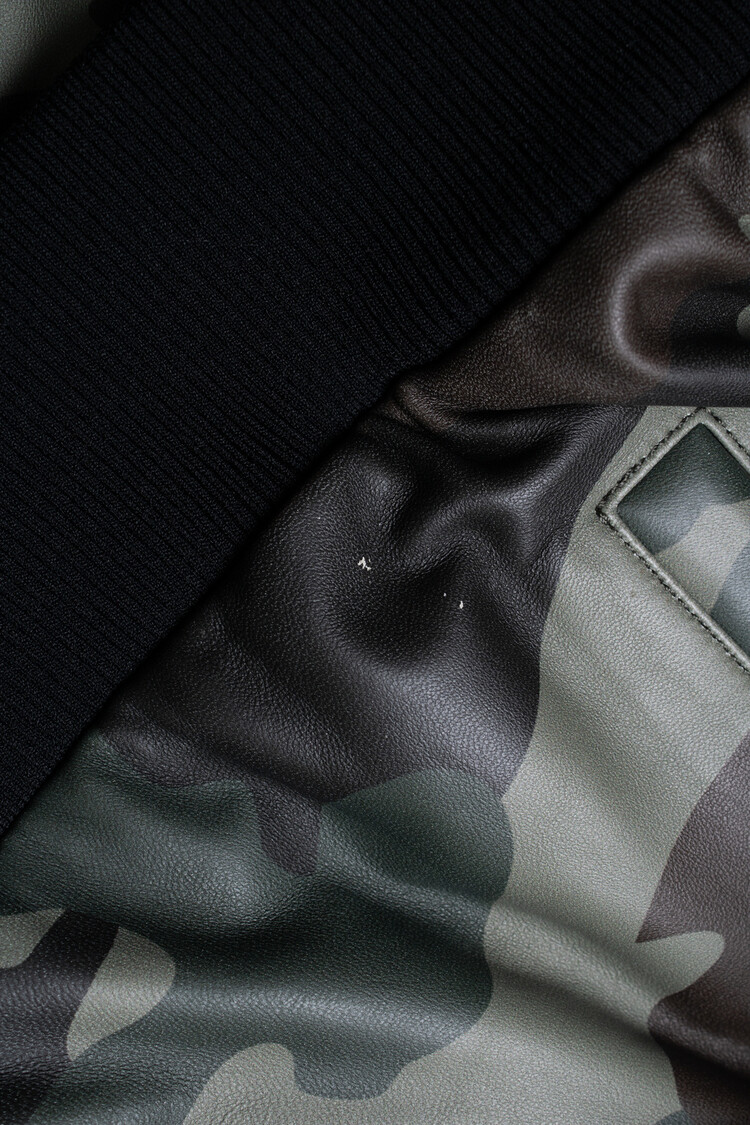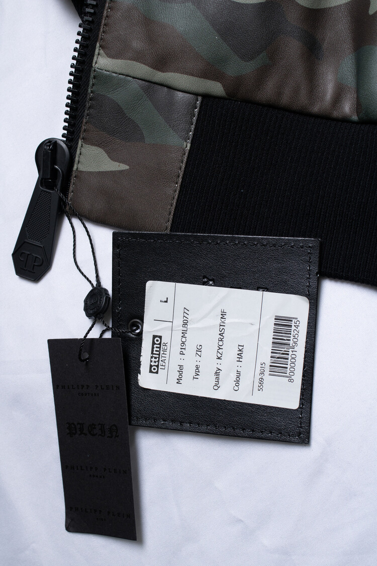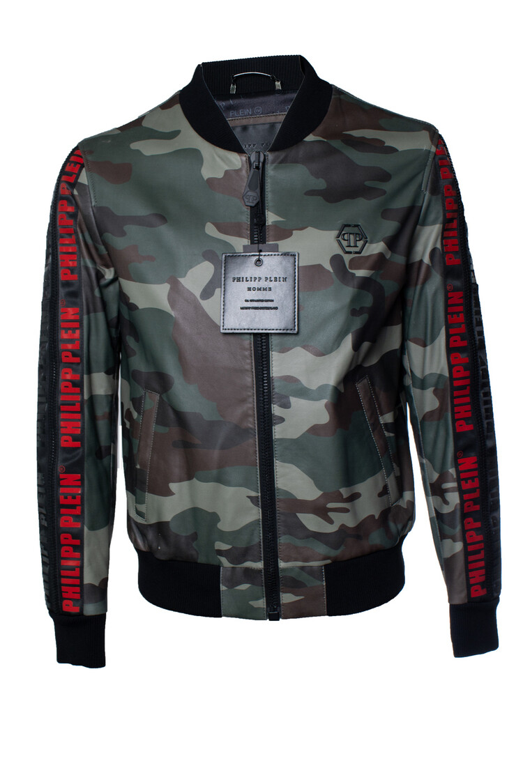 • Philipp Plein, camo leather bomber jacket with red logo on the sleeves. The item is new with tag. A few scuffs under the pocket and on the shoulder.