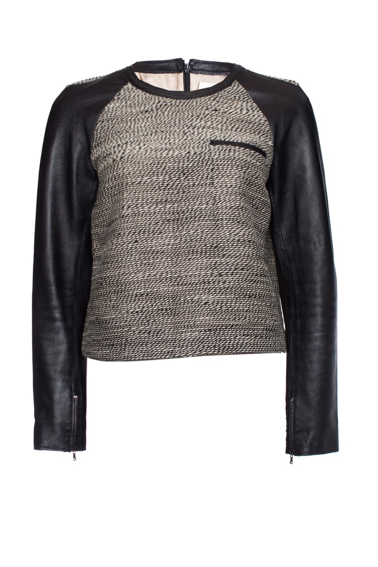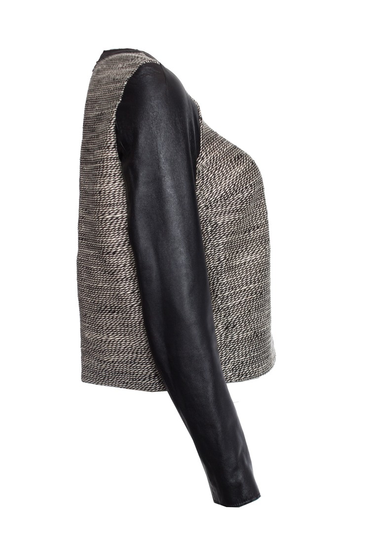 This tweed top features leather trim and leather long sleeves. Scoop neck and welt bust pocket. Hidden back zip. Lined.
