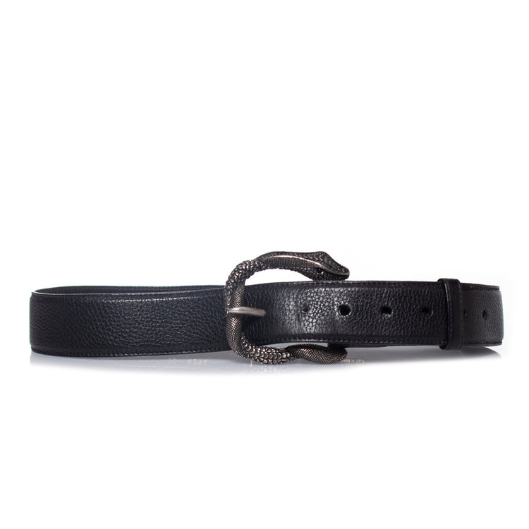 • Prada, Black grained leather belt with snake buckle. The item is in good to very good condition with no signs of wear.