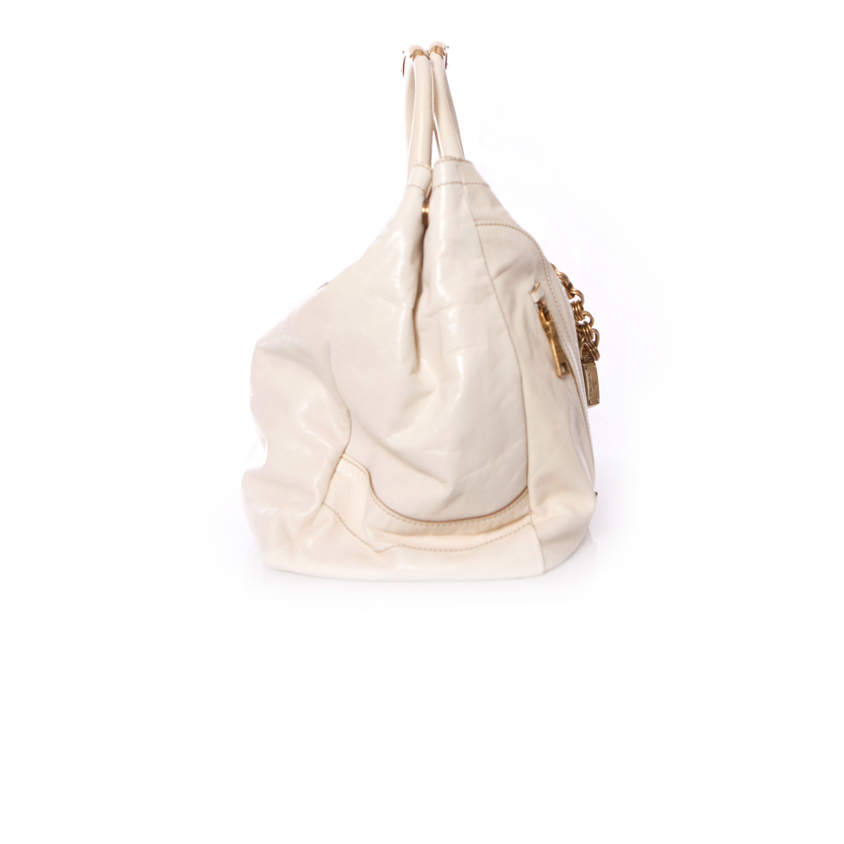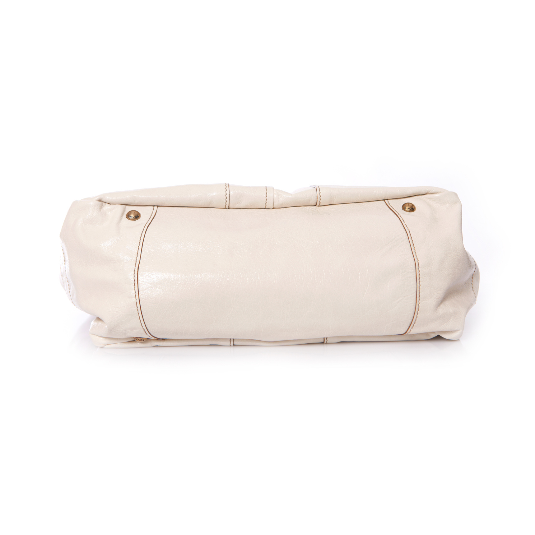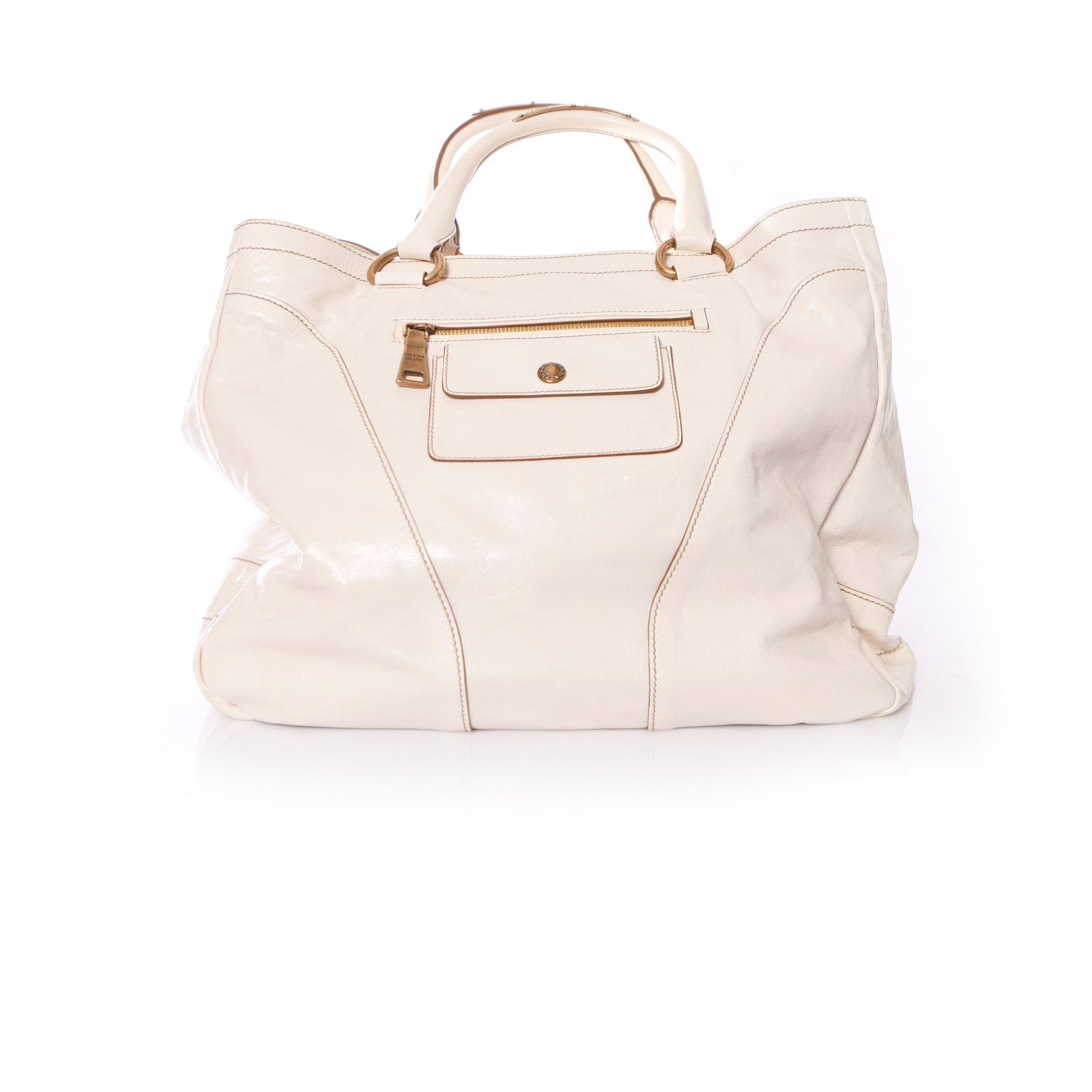Prada, off-white glace calf leather coated shopper with golden chain. Lining of the bag is in pink/nude calf leather. This product has been worn only once or twice and is in excellent condition.