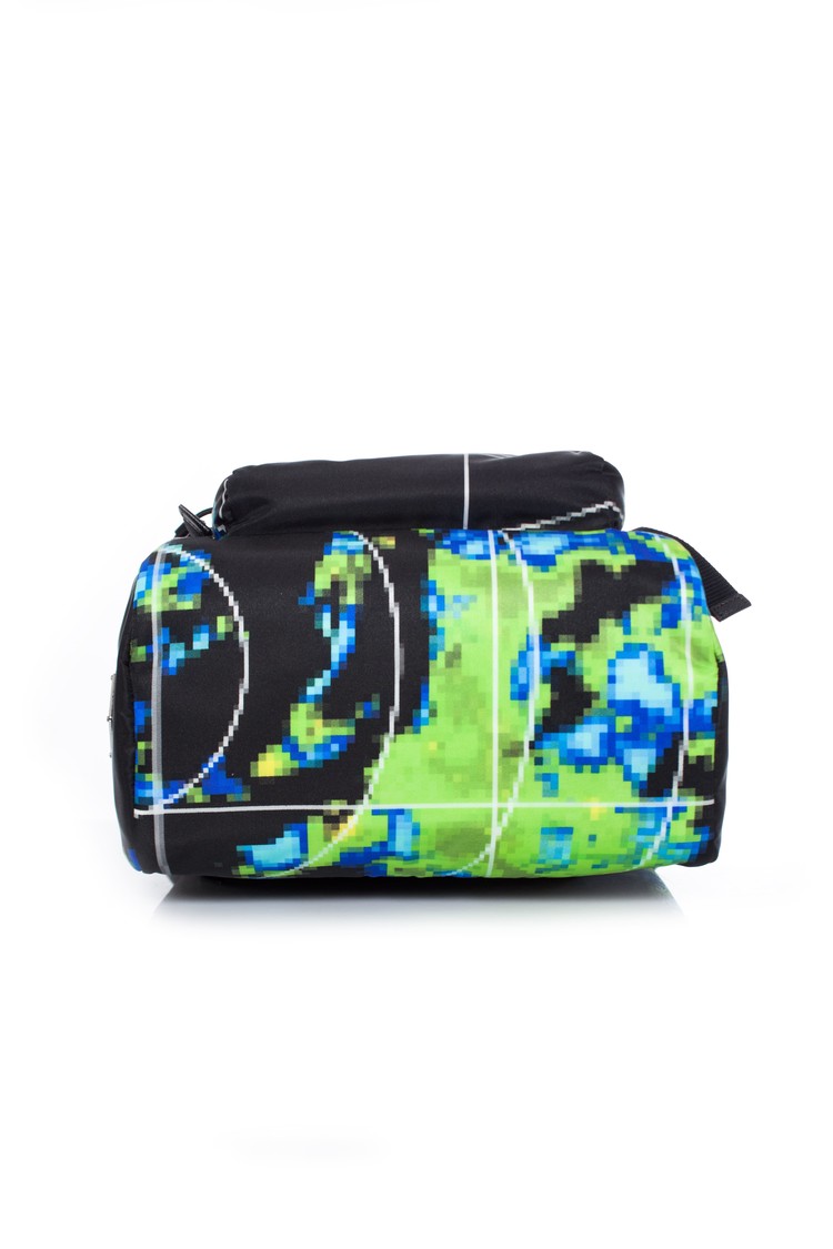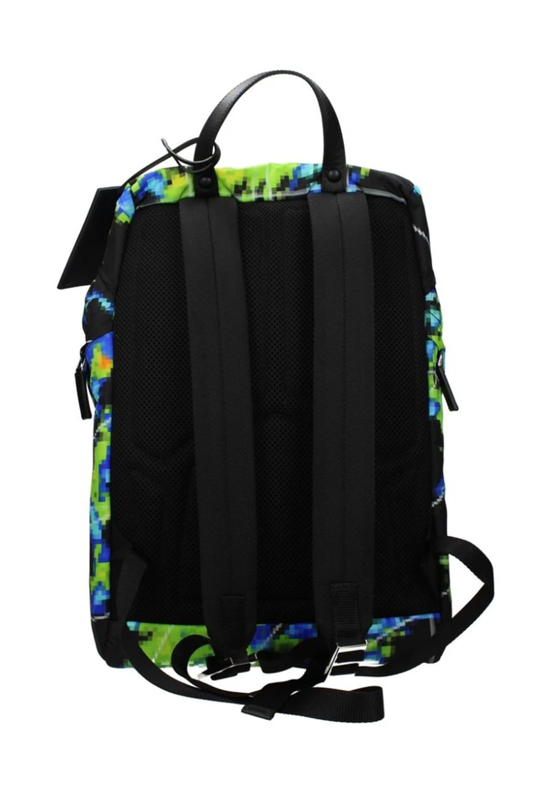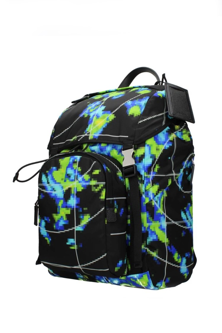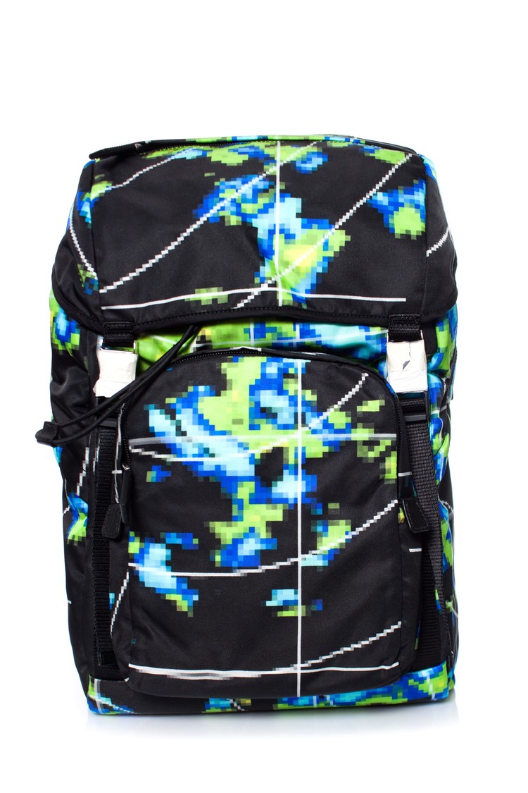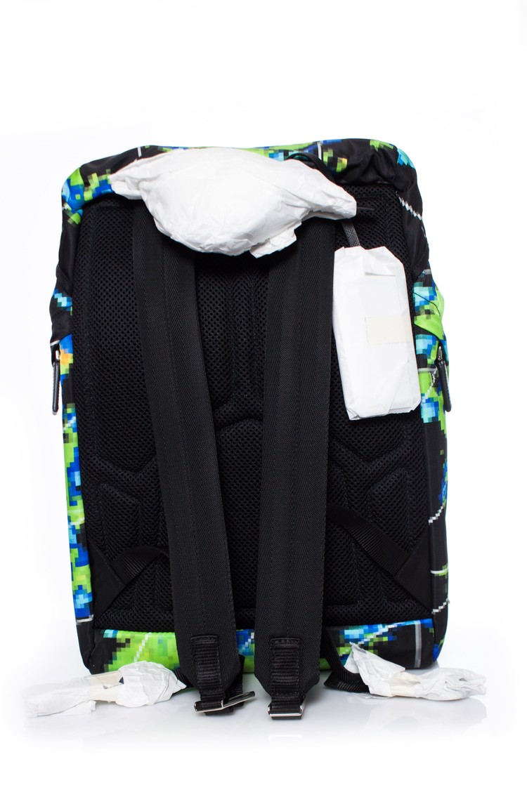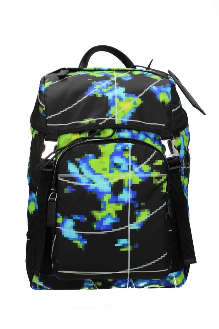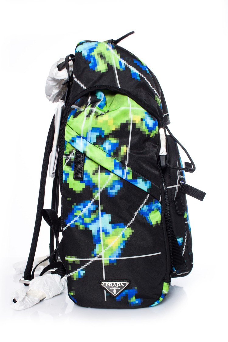 Prada nylon backpack with radar print, one front pocket and two side zip pockets. Side triangle logo, padded back and adjustable shoulder straps. The backpack has a drawstring closure and two buckles on the flap, saffiano handle and name tag. It also has a nylon lining and two inside pockets. Composition: 100% nylon